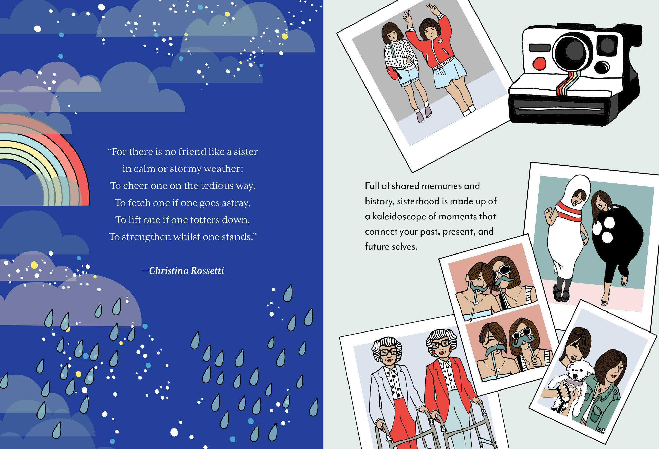 “A fun reminder that sisters are amazing friends and should be cherished. This book is wonderfully illustrated with all different kinds of sisters and helps you to see the power of a sister—even when you’re arguing! A great gift for the sisters—biological or chosen—in your life.”Joy Cho, author and founder and creative director of Oh Joy! "On the surface, this is a fantastic, freewheeling journey celebrating sisters through time and space, but once you really take it all in, you'll never quite look at sisters, especially your sister, quite the same way again." — Sarah Schwartz, host of The Paper Fold podcast and editor-in-chief of Stationery Trends Magazine