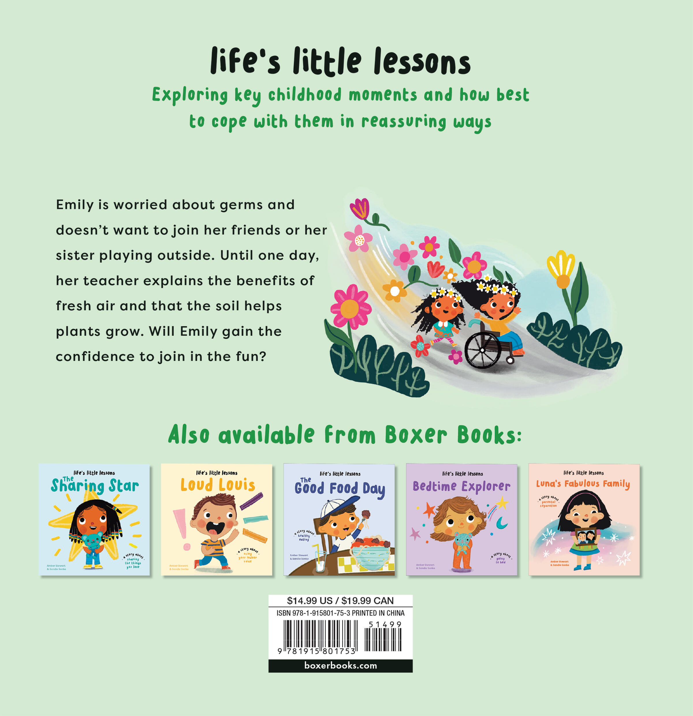 Rey is a complete whiz-kid, and her wheelchair is state of the art. She loves to play outside, splashing through puddles, and the neighborhood park. Rey’s younger sister Emily is worried about germs— she hangs back and won’t join in. At school, she learns about good dirt through gardening, the benefits of fresh air, and how this can stop you from getting sick. Together Emily and her friends learn about everyday hygiene and not sharing germs: catch a sneeze and toss it, wash your hands after using the bathroom, before eating, or helping in the kitchen. Knowing the difference between good dirt and how to avoid passing on everyday germs gives Emily the confidence to join in the fun.