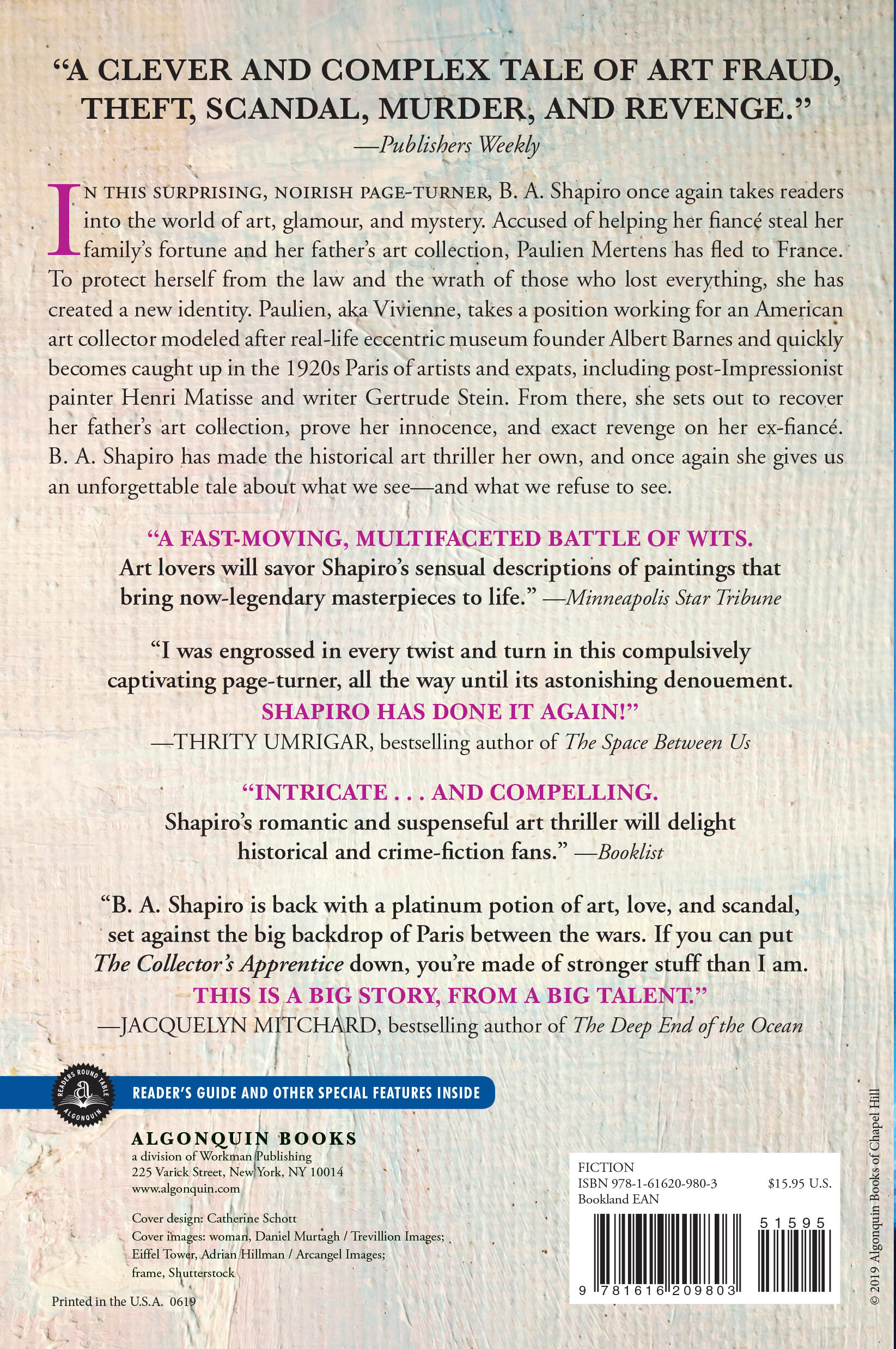 “Shapiro delivers a clever and complex tale of art fraud, theft, scandal, murder, and revenge. [Her] portrayal of the 1920s art scene in Paris and Philadelphia is vibrant, and is populated by figures like Alice B. Toklas and Thornton Wilder; readers will be swept away by this thoroughly rewarding novel.”San Francisco Book Review