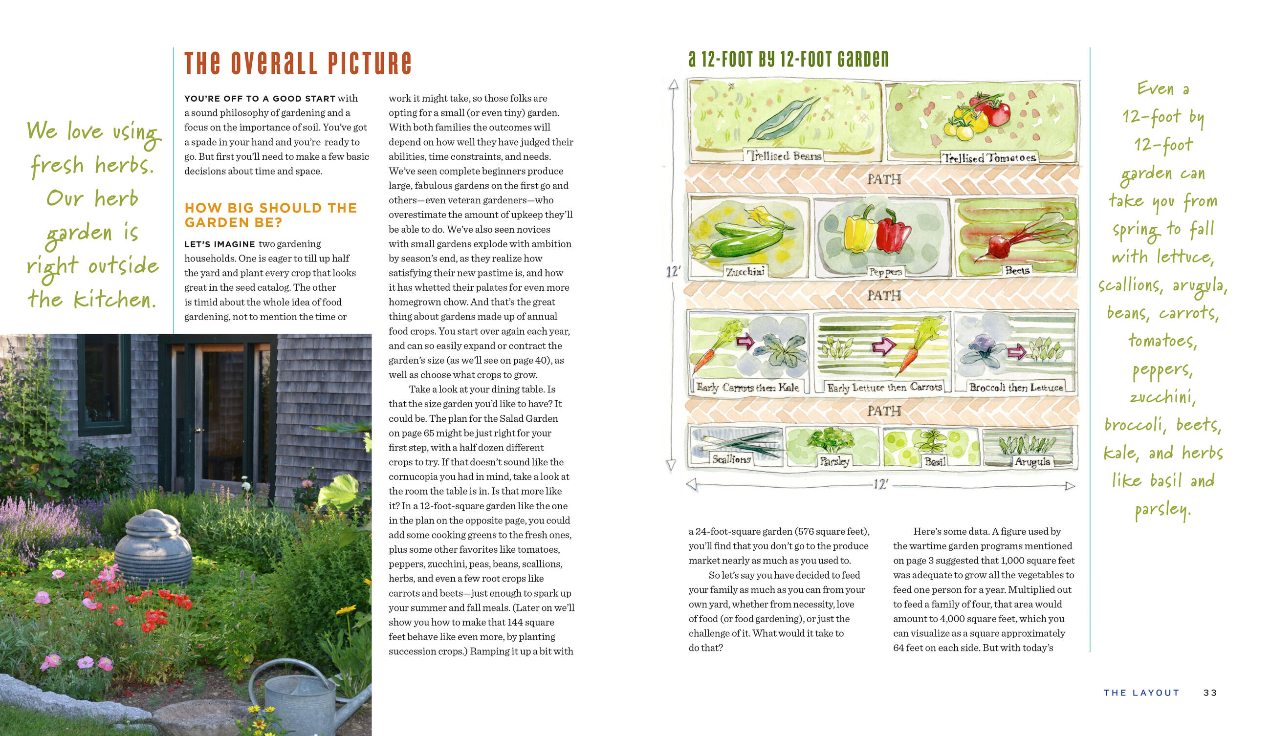 And it’s a step-by-step garden guide that works no matter how big or small your plot, with easy-to-follow instructions and plans for different gardens. It covers size of the garden, nourishing the soil, planning ahead, and the importance of rotating crops—yes, even in your backyard. And, at the core, individual instructions on the crops, from the hardy and healthful cabbage family to fourteen essential culinary herbs.