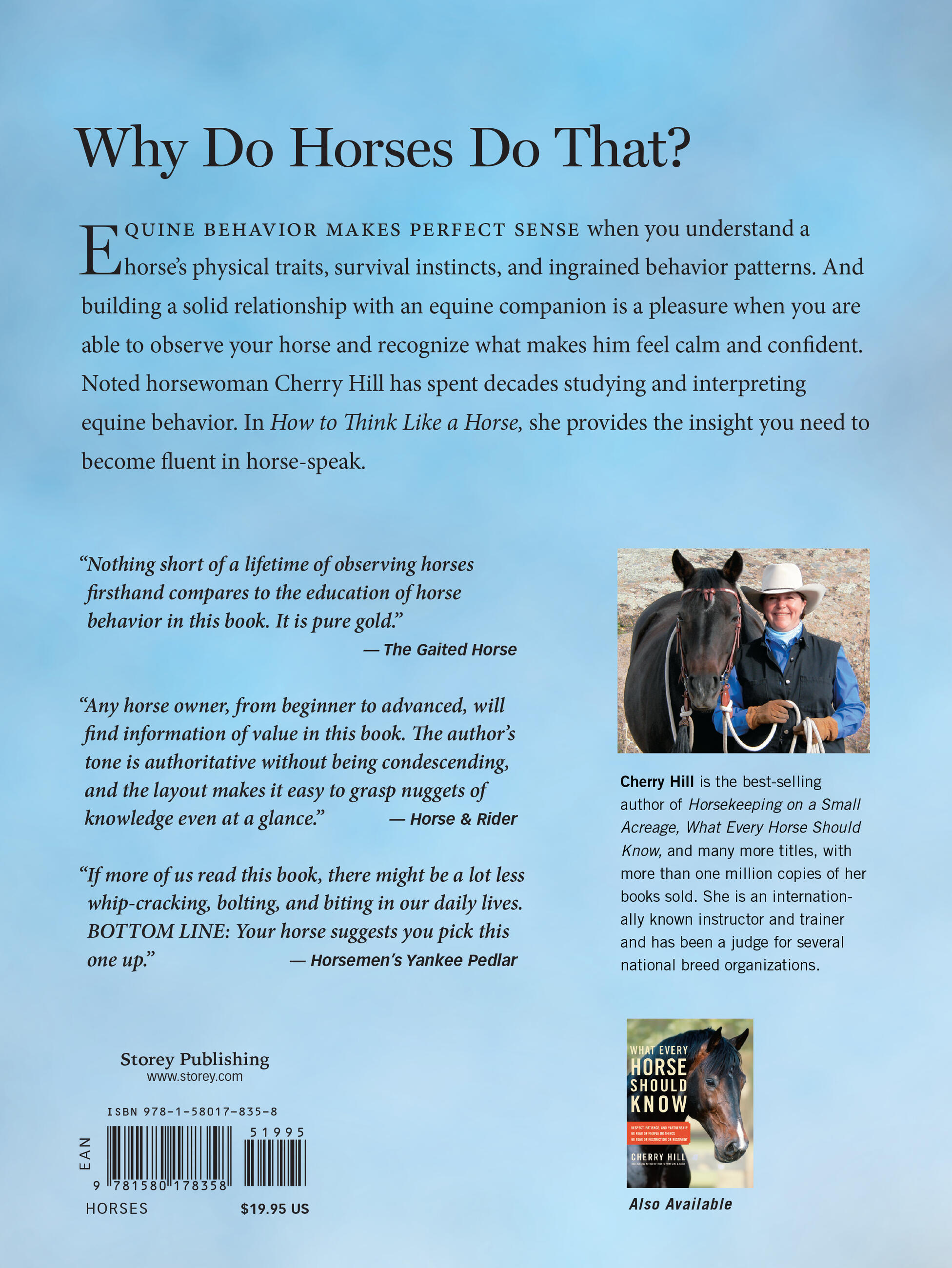 Cherry Hill is an internationally known instructor and horse trainer and has written numerous books, including 101 Arena Exercises for Horse & Rider, Horsekeeping on a Small Acreage, How to Think Like a Horse, What Every Horse Should Know, and Horse Care for Kids. Visit her at http://www.horsekeeping.com, where you can find information on her books, DVDs, and horsekeeping knowledge.