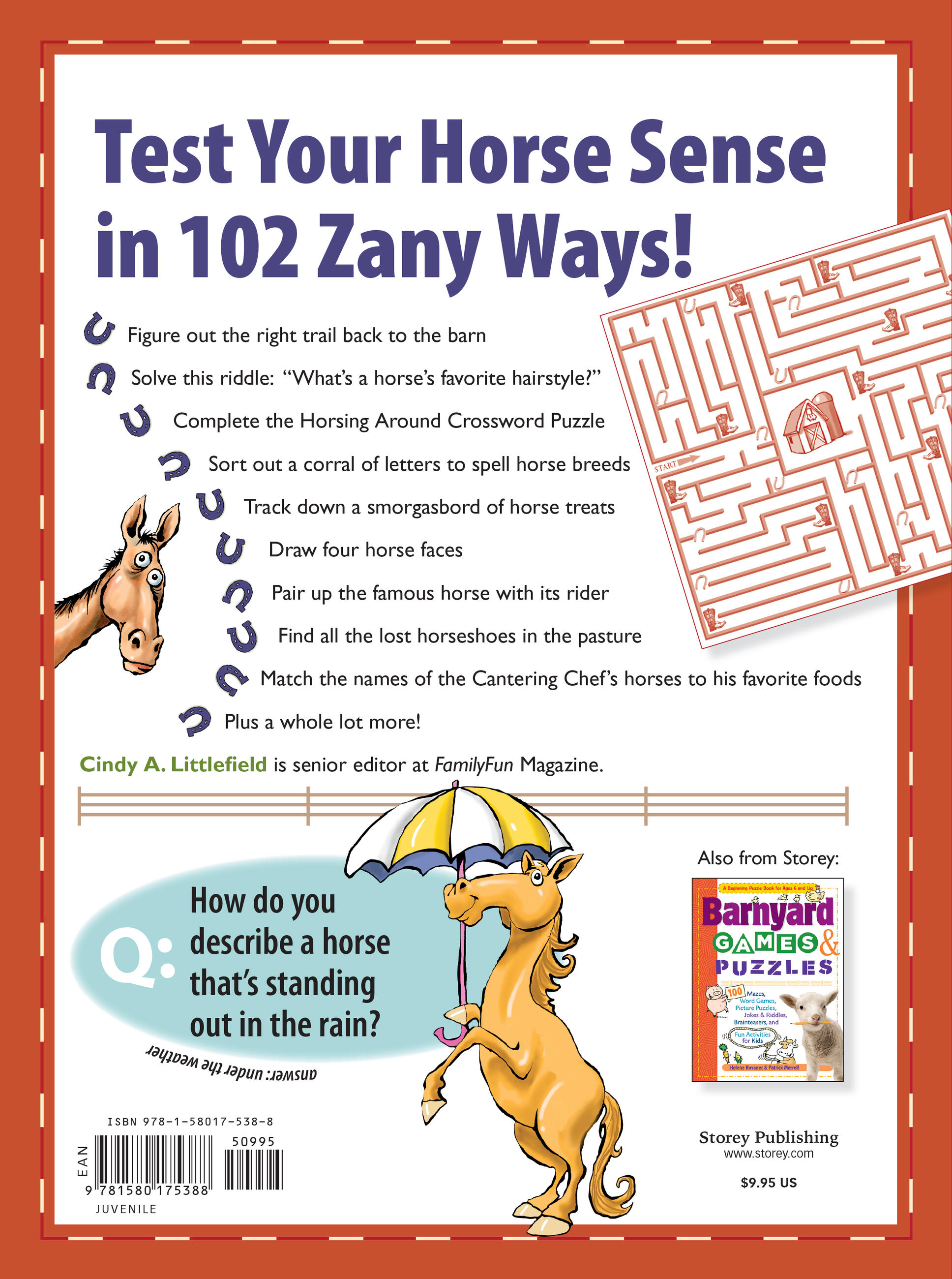Cindy A. Littlefield presents 102 brainteasers, word games, jokes, riddles, and puzzles that will keep horse-crazy children entertained for hours. Packed with fascinating bits of equine trivia and plenty of illustrations, this book will jumpstart kids’ creativity and boost their problem-solving skills, while at the same time teaching them about their favorite animals. Get ready for some serious horsing around.