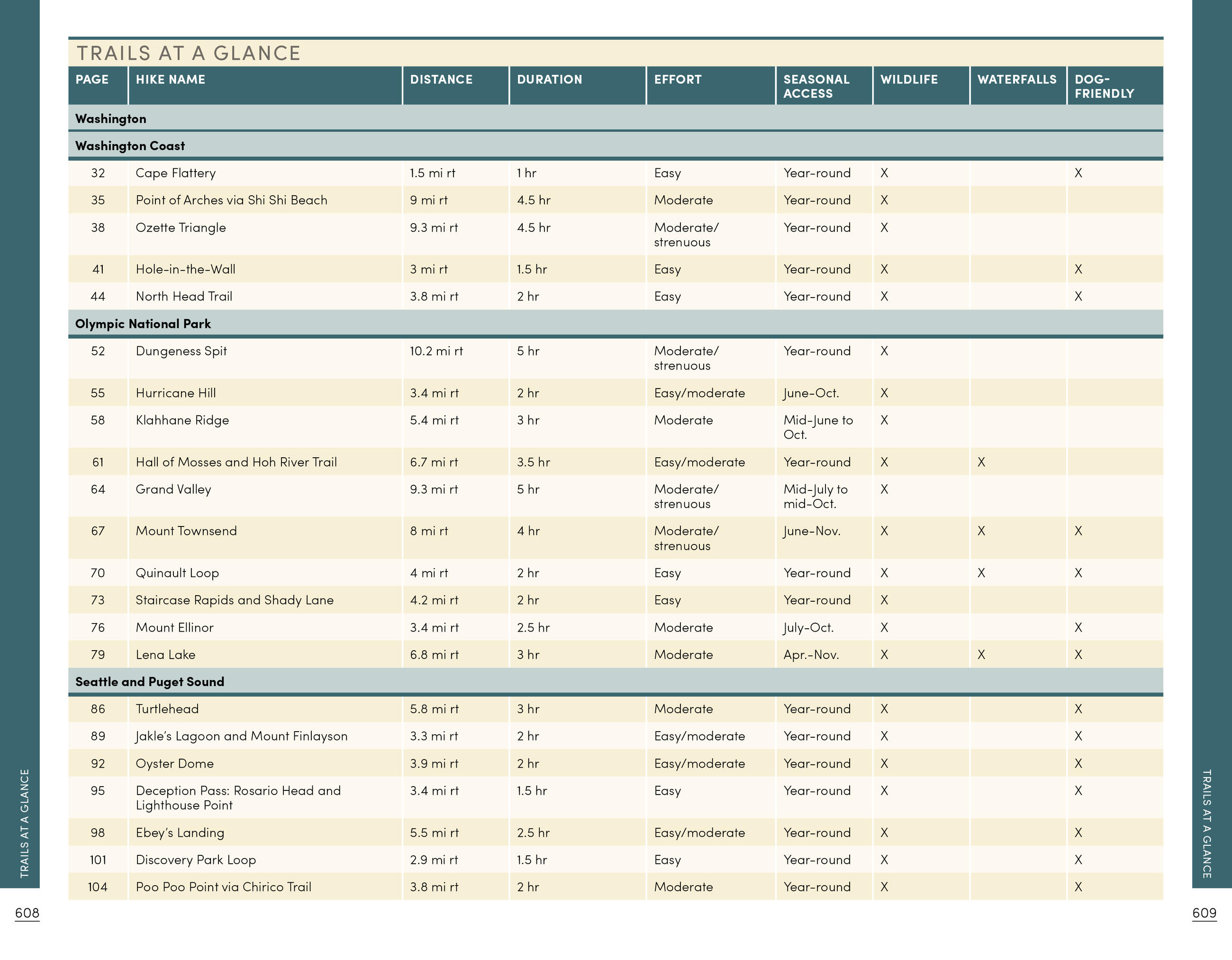 - Essential Planning Details: Each hike is described in detail and marked with round-trip distance and hiking time, difficulty, terrain type, elevation gain, and access points