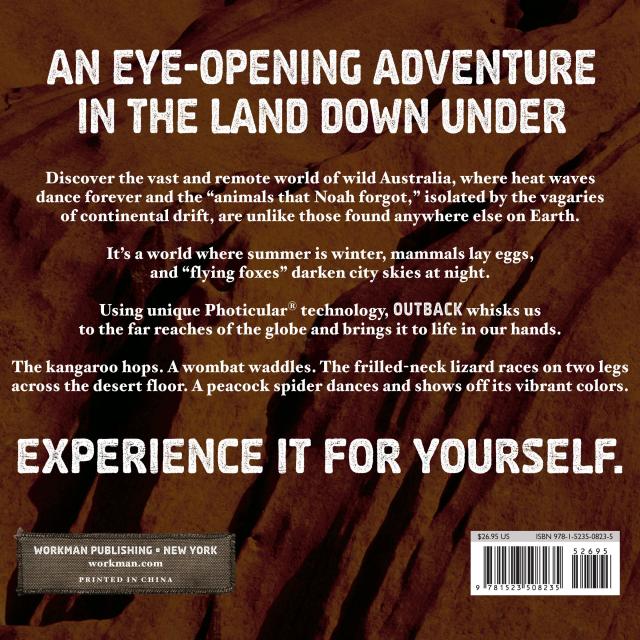 Using Photicular technology—an innovative lenticular-based technology that uses precision sliding lenses and four-color video imagery—each image is like a 3D movie on the page, delivering a rich, fluid, immersive visual experience, whisking you to the vast, remote world of wild Australia, where heat waves dance forever and animals, isolated by the vagaries of continental drift, are unlike those found anywhere else on Earth. The kangaroo hops. A wombat waddles. The frilled lizard races on two legs across the desert floor. A peacock spider dances and shows off its vibrant colors.