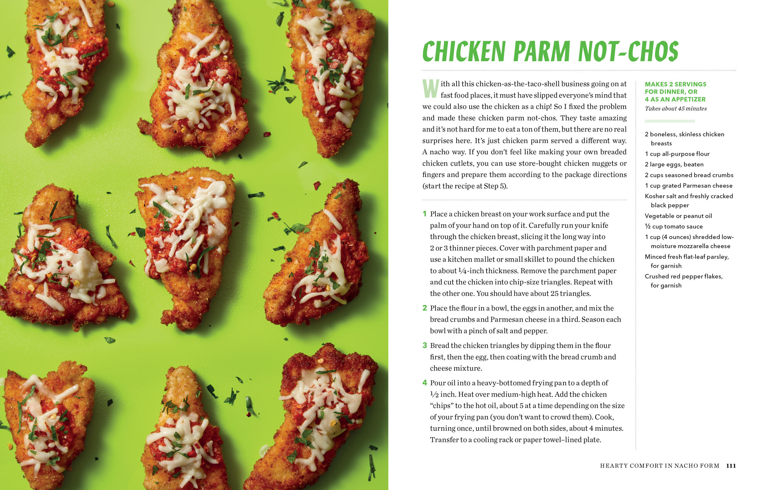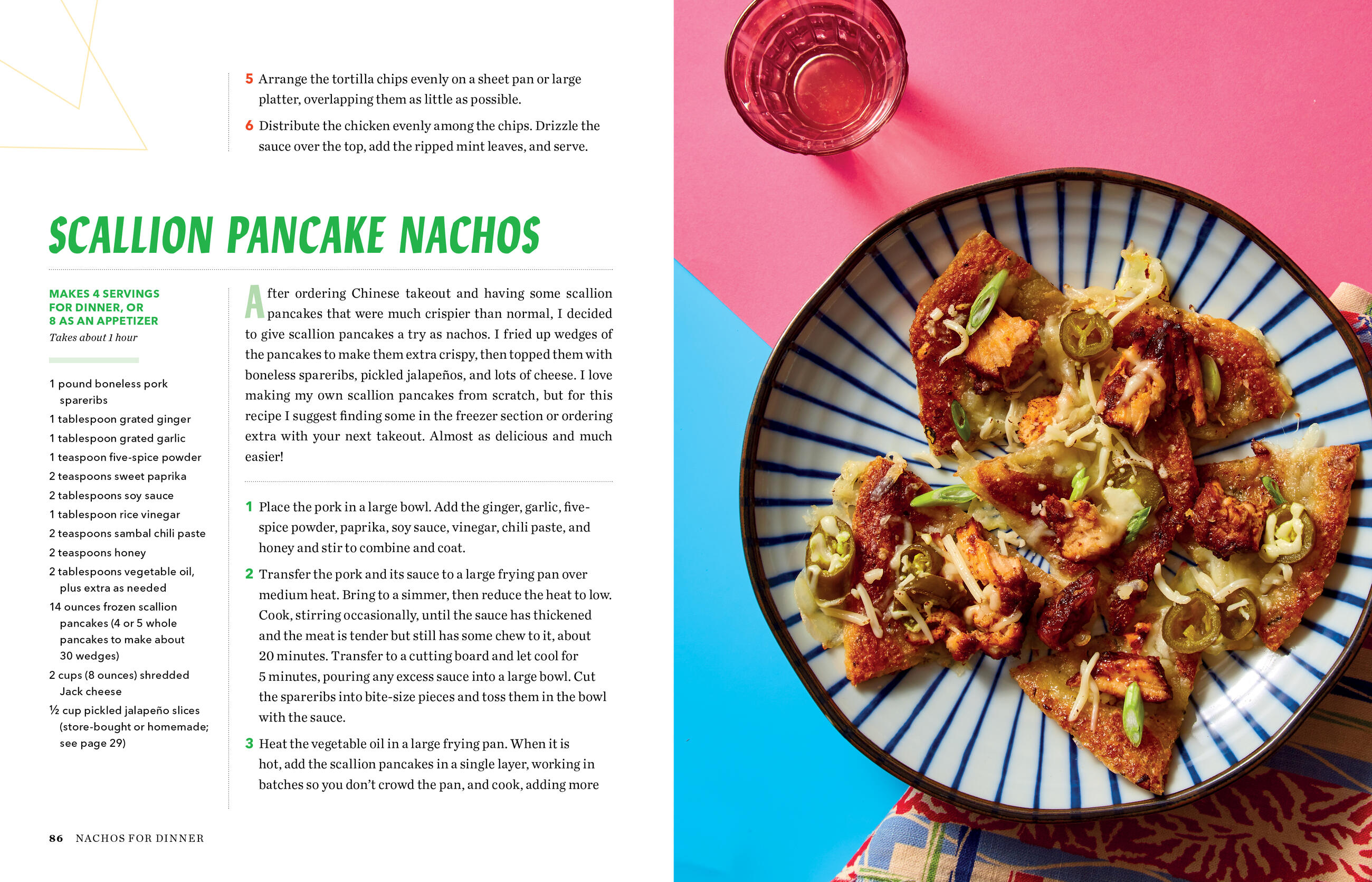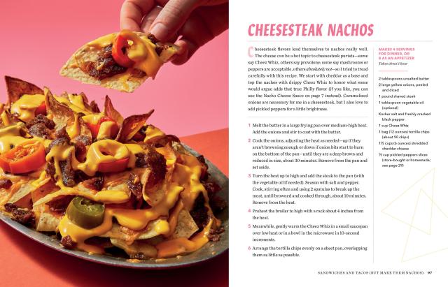 Of course there’s the chips-and-cheese classic, but then the nachos veer decidedly into dinner, with favorites from every part of the meal from French Onion Nachos, Buffalo Chicken Nachos, and Cobb Salad Nachos to Fish Taco Nachos, Banh Mi Nachos, and Shrimp and Grits Nachos. And there are plenty of not-chos (that is, nachos that use other ingredients for the chips)—like Lasagnachos, Scallion Pancake Nachos, and Pretzel and Brat’chos. Even Apple Pie Nachos for dessert.