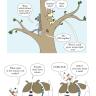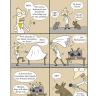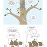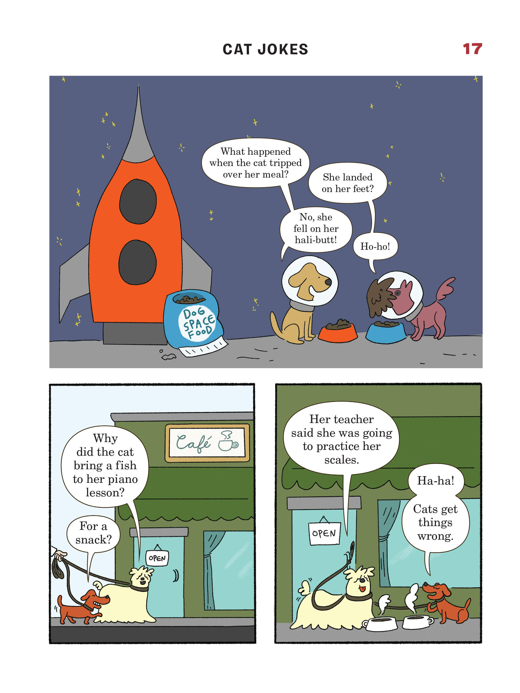 Presented in a read-from-both-sides format, the first half of the book consists of cat jokes told by a recurring cast of dogs (What do you call an insect in a cat’s bathroom? A litterbug!). Flip the book over to start from the other side, and it becomes a book of dog jokes told by cats (What’s the difference between kibble and a heavy mist? One is dog food, and the other is fog, dude!) In the middle spread, the casts of cartoon dogs and cats come together for a mid-book finale of shared giggles, snorts, and guffaws.
