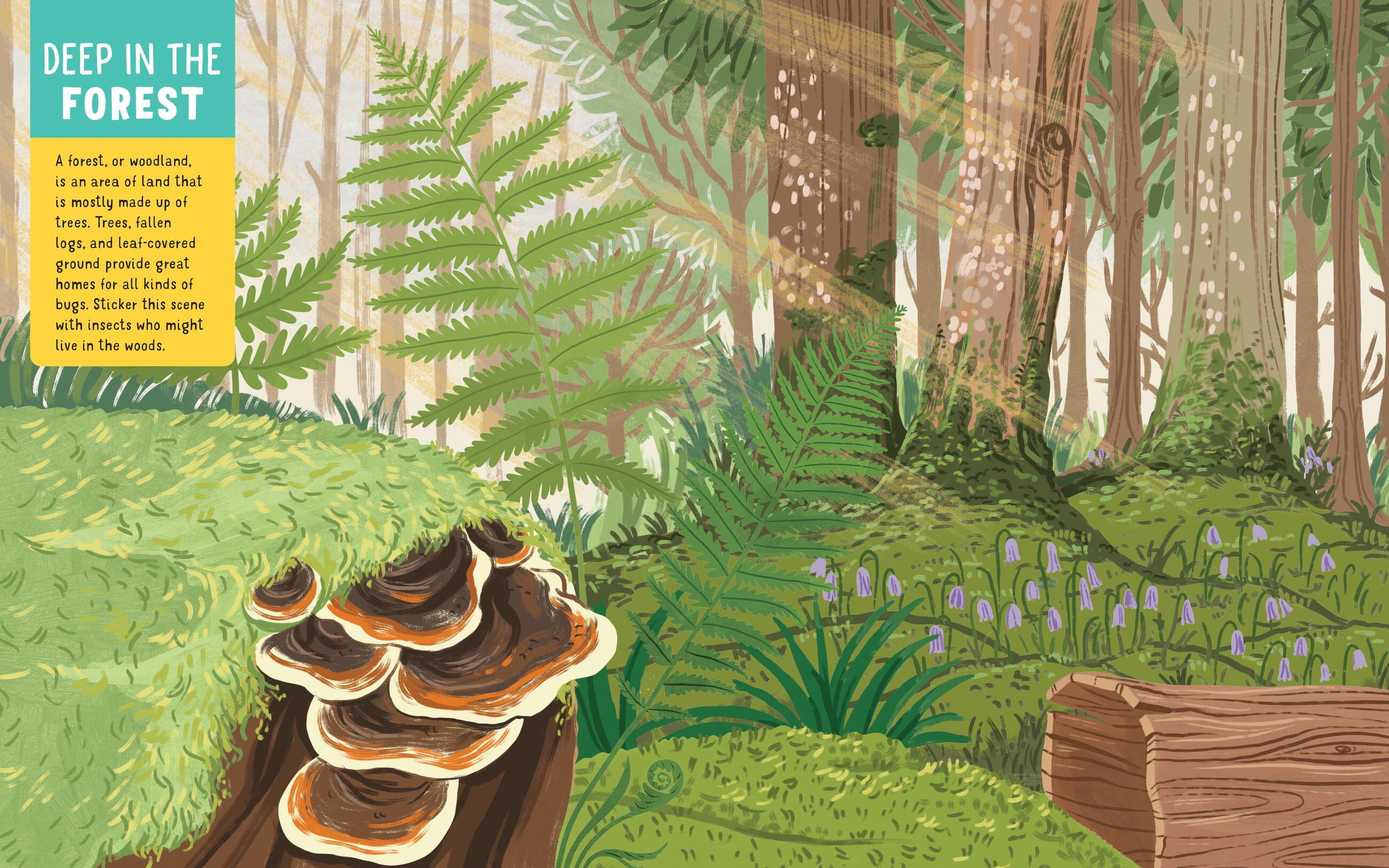 Explore bug habitats by adding stickers to the Sunny Meadow, Deep in the Forest, Life in the Water, and Backyard Garden scenes.
