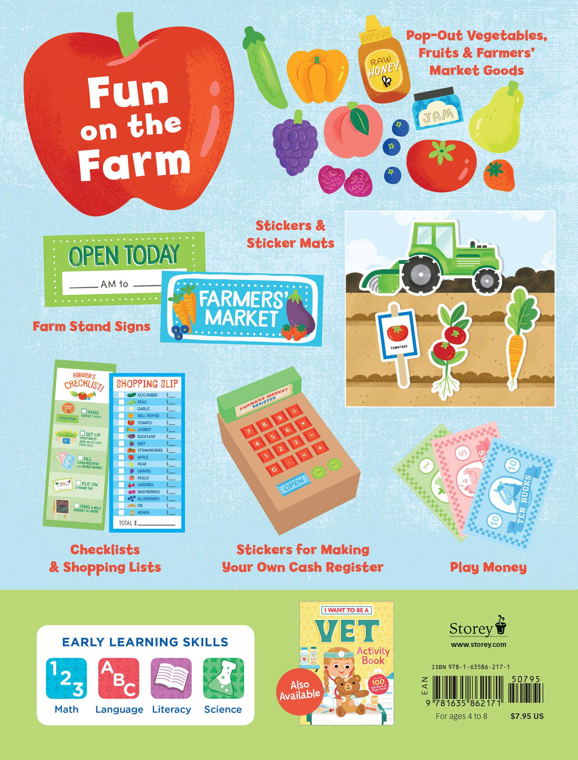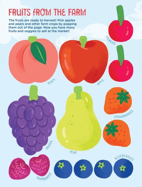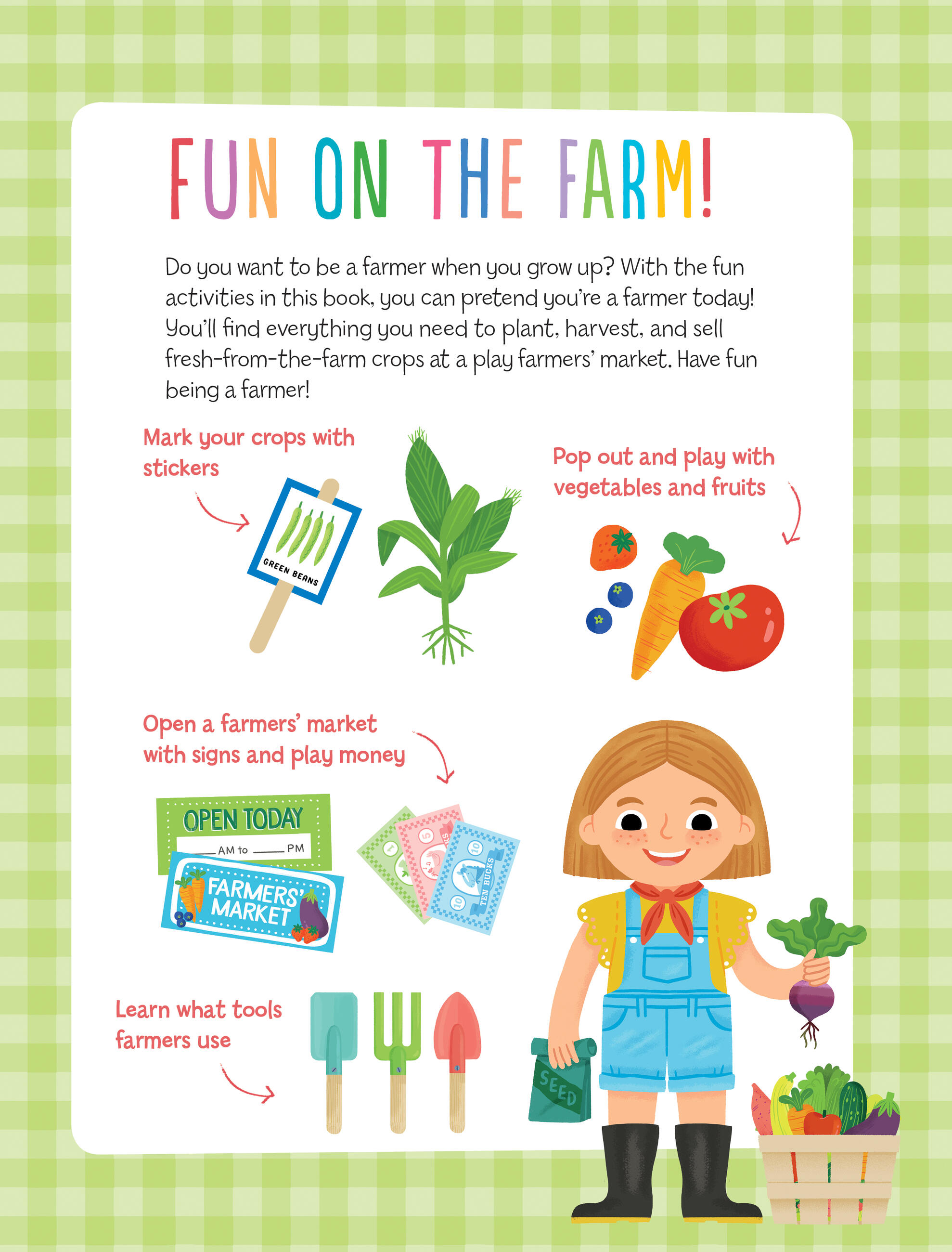 “When I grow up, I want to be a farmer!” This fun activity book inspires creative role-play and hours of learning fun on the farm. With stickers, checklists, and pop-out pieces, everything a little farmer needs to plant, harvest, and sell fresh-from-the-farm crops at a pretend market can be found here. From illustrated crop stickers and pop-out fruits and vegetables to farmers’ market signs and play money, every element of this colorful, interactive package encourages kids to learn more about farms, farmers, and food while offering a bounty of inspiration for imaginative play.
