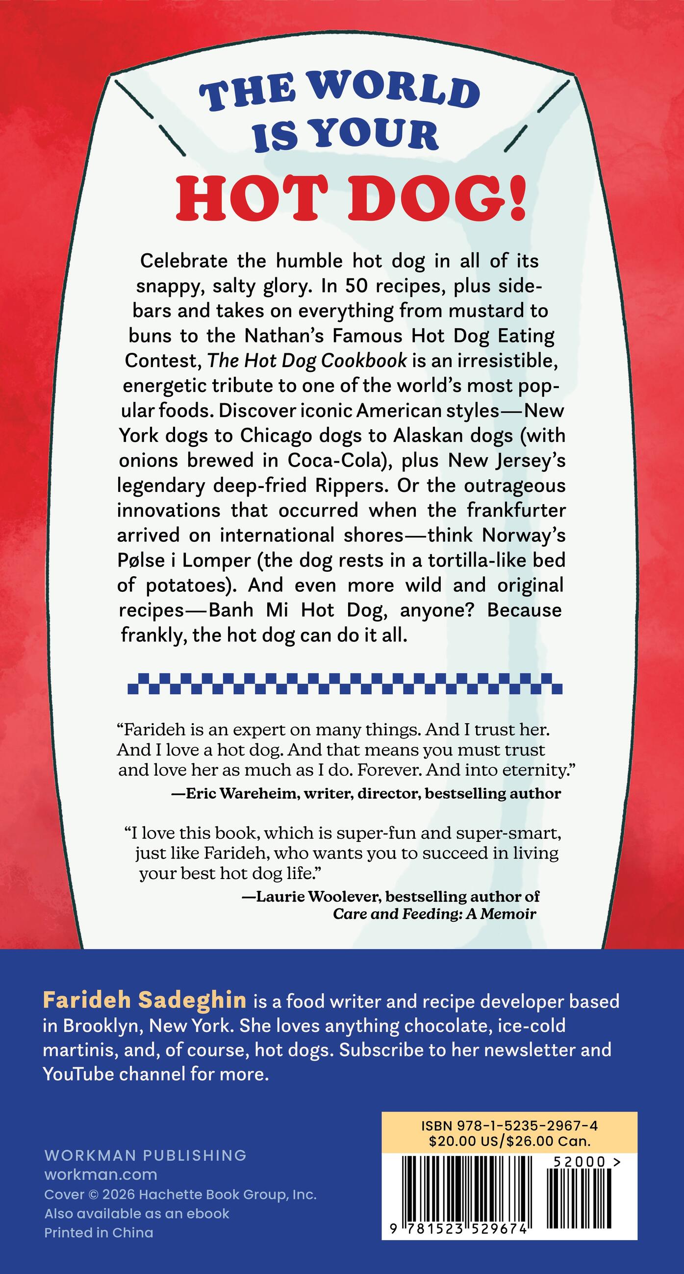 "I love this book, which is super-fun and super-smart, just like Farideh, who wants you to succeed in living your best hot dog life. The Hot Dog Cookbook is a complete roadmap for cooking and eating hot dogs in every great regional American style and from around the world.”