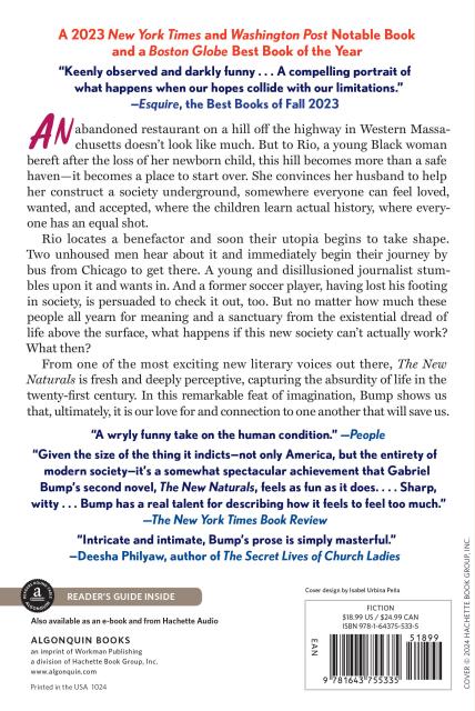 • “Gabriel Bump's brilliant and surprising novel The New Naturals takes us inside a utopian world and, even more deeply and wondrously, inside the souls of an impressive array of characters. Through them, Bump holds up a mirror to our own grief, longings, and rage in the face of a cruel, crumbling society. Intricate and intimate, Bump's prose is simply masterful.”