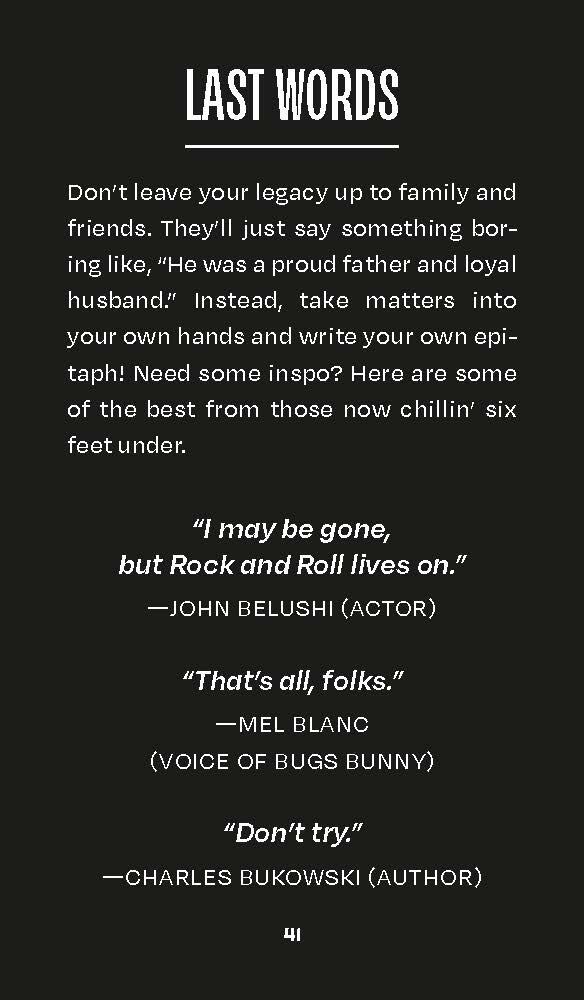 • Fully Illustrated Pocket Guide to Death: The full-color companion book includes all facets of death trivia, from the odds of dying from freak accidents to famous movie deaths and the origins of idioms like “kick the bucket.”