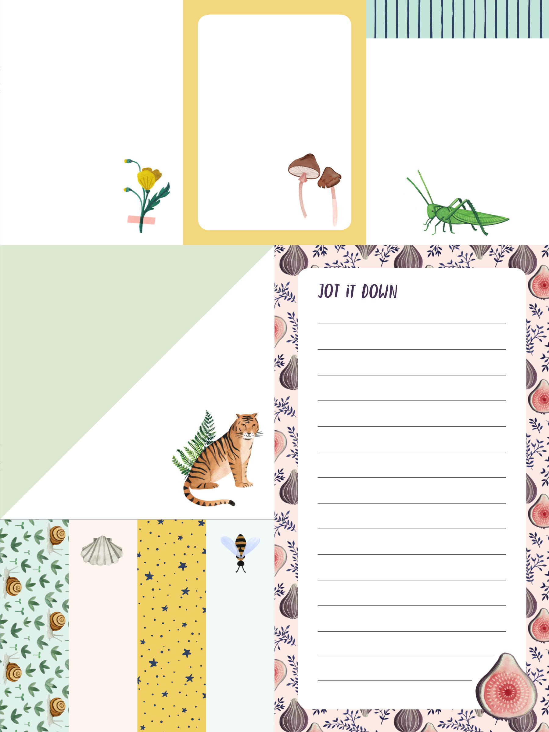 - 9 illustrated stick note pads in tabs of assorted sizes