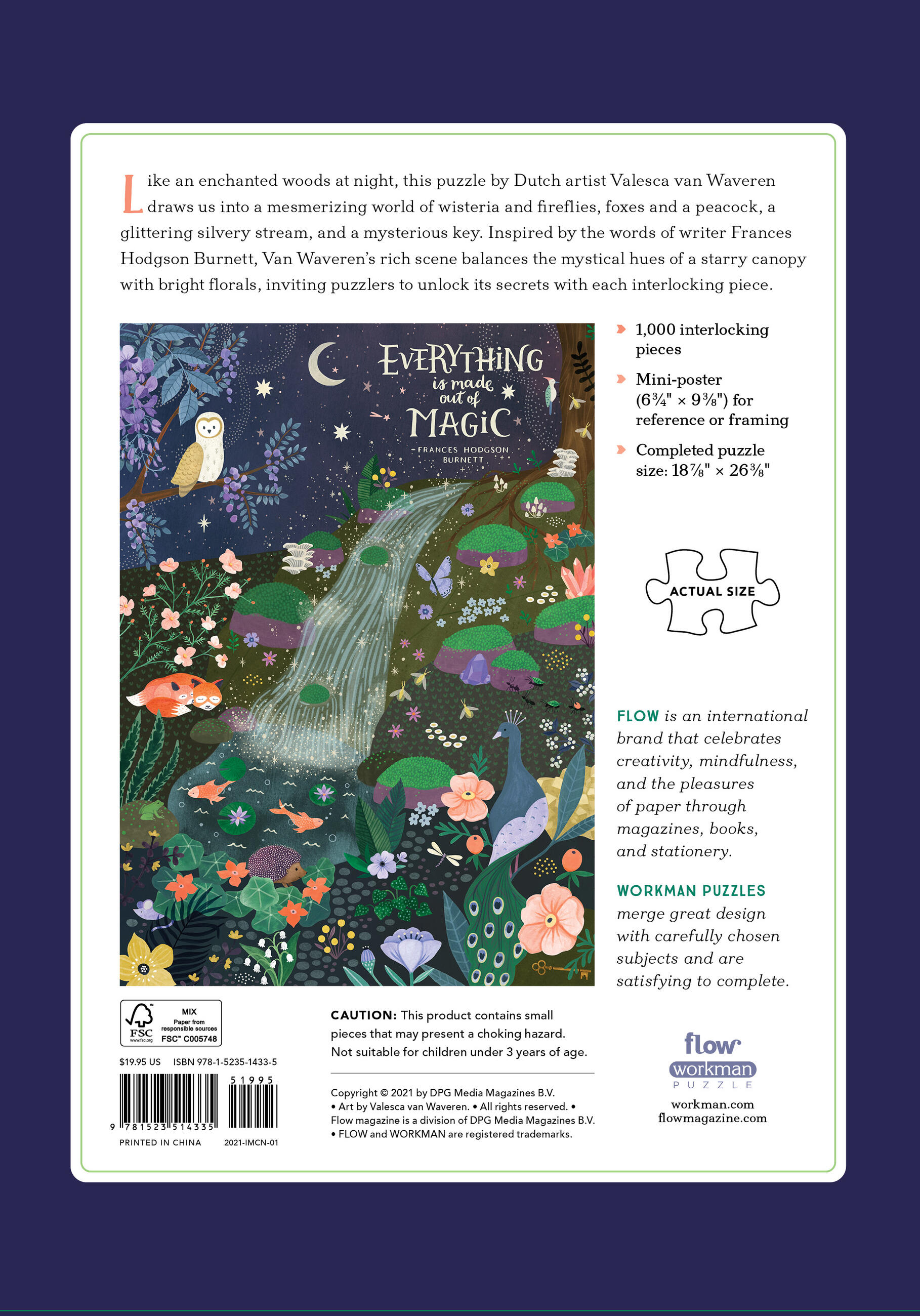 This puzzle by Dutch artist Valesca van Waveren draws us into a mesmerizing world of wisteria and fireflies, foxes and a peacock, a glittery silvery stream, and a mysterious key. Inspired by the words of writer Frances Hodgson Burnett, Van Waveren’s rich scene balances the mystical hues of a starry canopy with bright florals, inviting puzzlers to unlock it’s secrets with each interlocking piece.