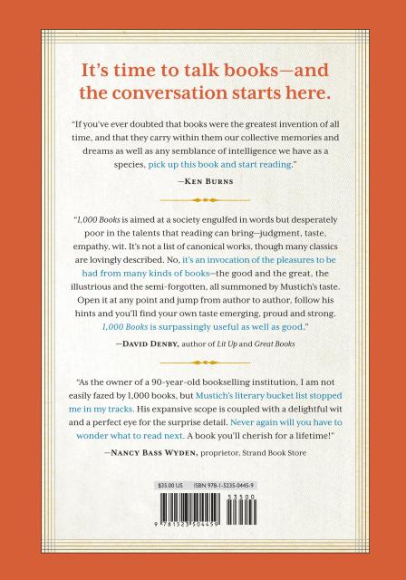 “If there’s a heaven just for readers, this is it.” — O, The Oprah MagazineBooklist, Starred Review "All in all, the literate public—what novelist Robertson Davies dubbed the clerisy—can only be grateful for, and awed by, this product of 14 years of reading and research…It’s hard to imagine that such a massive compendium could have been done better."—Michael Dirda, The Washington Post "Absolutely impressive…. This book is not just a source of information; it's a wellspring of wisdom, intelligence, empathy and generosity."—Ingrid Rossellini, author of Know Thyself: Western Identity from Classical Greece to the Renaissance "As the owner of a 90-year-old bookselling institution, I am not easily fazed by 1,000 books, but Mustich’s literary bucket list stopped me in my tracks. His expansive scope is coupled with a delightful wit and a perfect eye for the surprise detail. Never again will you have to wonder what to read next. A book you’ll cherish for a lifetime!" —Nancy Bass Wyden, Proprietor, Strand Book Store "Chief among the thousands of pleasures here is the delightfully erudite company of James Mustich. Look up your favorite books; find ones you don’t know; argue about the list with friends. Read!" —Jean Strouse, author, Alice James and Morgan: American Financier "James Mustich’s book is aimed at a society engulfed in words but desperately poor in the talents that reading can bring—judgment, taste, empathy, wit. The book is not a list of canonical works, though many classics are listed and lovingly described. No, the “1000 Books to Read” is an invocation of the pleasures to be had from many kinds of books—genre fiction, journalism, poetry, history, and memoir, the good and the great, the illustrious and the semi-forgotten, all summoned by Mustich’s taste. You open it at any point and jump from author to author; you follow his hints and read related works by other writers, and you find your own taste emerging, proud and strong, from Mustich’s provocations. 1,000 Books is surpassingly useful as well as good." —David Denby, staff writer at The New Yorker and author of Great Books: My Adventures with Homer, Rousseau, Woolf, and Other Indestructible Writers of the Western World "If you’ve ever doubted that books were the greatest invention of all time, and that they carry within them our collective memories and dreams, as well as any semblance of intelligence we have as a species, pick up James Mustich’s 1,000 Books to Read Before You Die and start reading." —Ken Burns "If I were as erudite, entertaining, insightful, and articulate as James Mustich, I could come up with 1,000 reasons to get his book. But here's one: Whether you're looking for something to read for personal edification or fun, for escapism or relevance, you can survey the literary world with Mustich as an experienced, enthusiastic guide. His work is an essential resource for anyone anywhere plagued by that infernal question: What do I read next?" —Bradley Graham, co-owner of Politics and Prose Bookstore