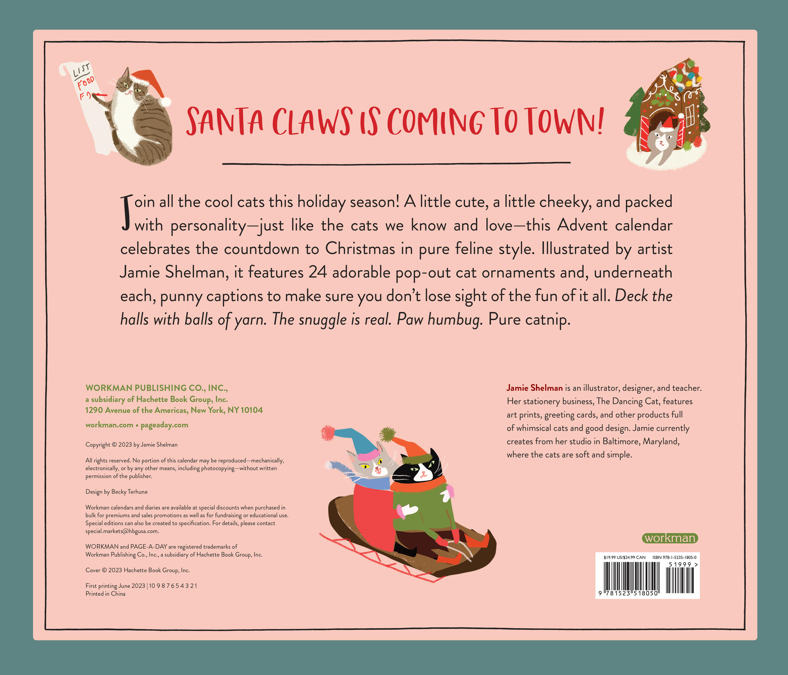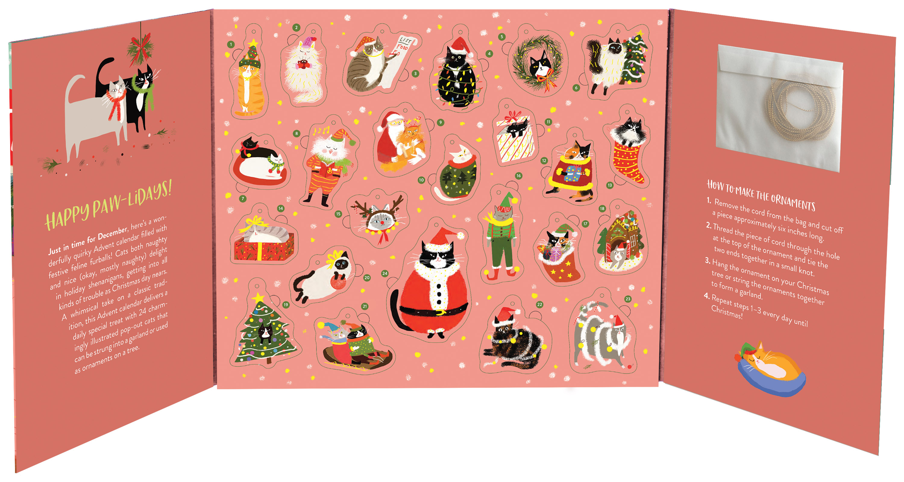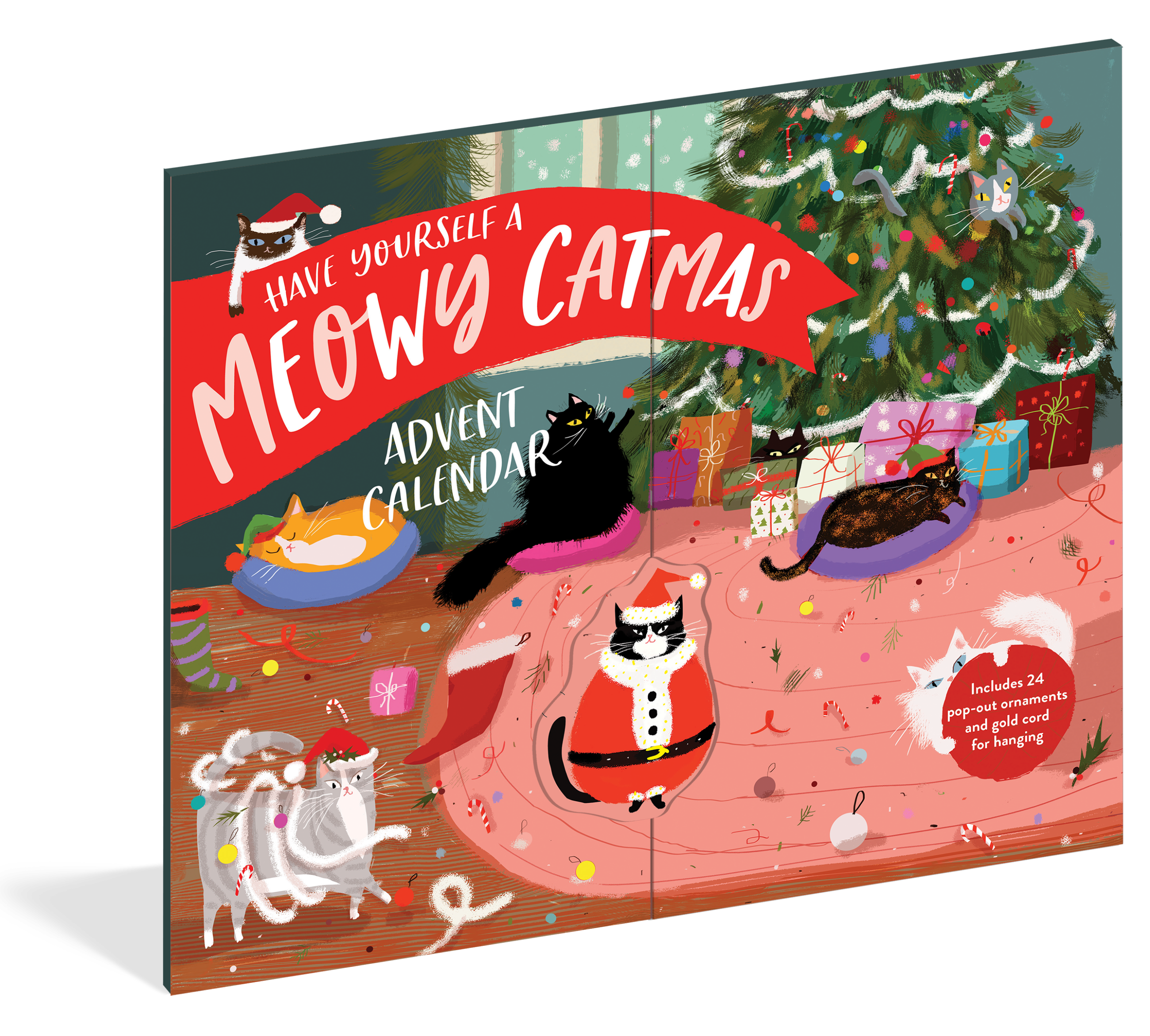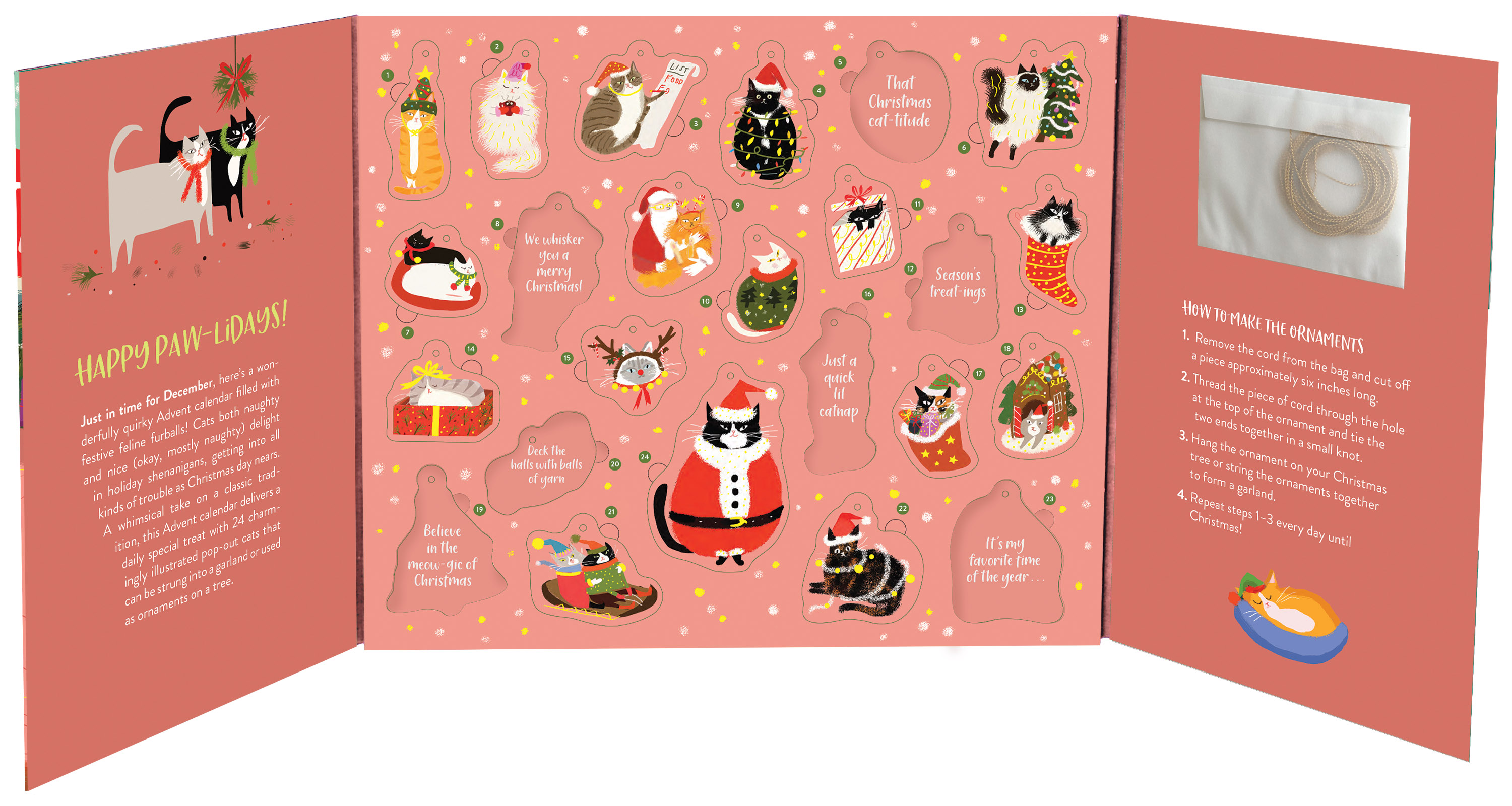 Join all the cool cats this holiday season! A little cute, a little cheeky, and packed with personality—just like the cats we know and love—this Advent calendar celebrates the countdown to Christmas in pure feline style. Illustrated by artist Jamie Shelman, it features 24 adorable pop-out cat ornaments and, underneath each, punny captions to make sure you don’t lose sight of the fun of it all. Deck the halls with balls of yarn. The snuggle is real. Paw humbug. Pure catnip.