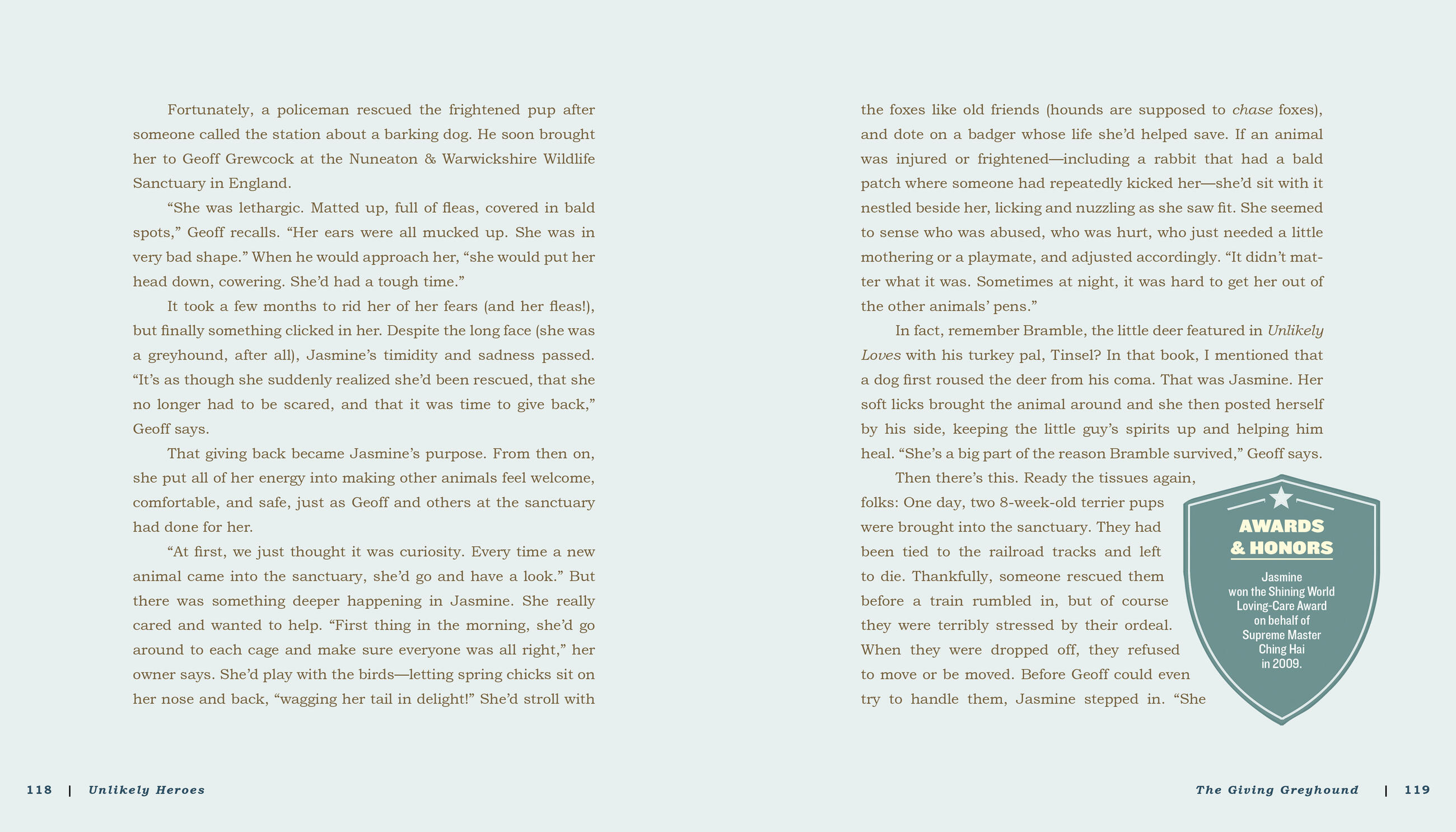 In Unlikely Heroes, Ms. Holland uncovers and celebrates yet another side of animals that we often think belongs primarily to people—heroism, that indefinable quality of going above and beyond, often for altruistic reasons, often at great personal risk. These 37 inspiring true tales show animals whose quick acts have saved lives, like the pod of dolphins who protected swimmers in New Zealand from a great white shark by forming a screen around them. There are stories of animals who simply and unselfishly give, like Rojo the llama, who shines his very special light of lovingkindness on the elderly patients in an Oregon rehab center.