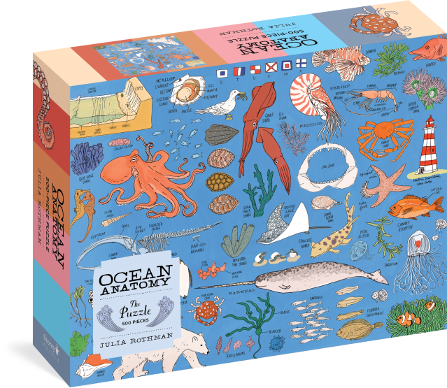 Embark on a journey of discovery, piece by piece. Featuring illustrations from Julia Rothman’s book Ocean Anatomy, this puzzle is a captivating visual tour of oceans, above and below the waves. From the steep cliffs of the seafloor to the patterns and shapes of sea turtle shells to the animals that populate polar ice, this gorgeous study of the marine world will delight and enlighten every ocean lover.