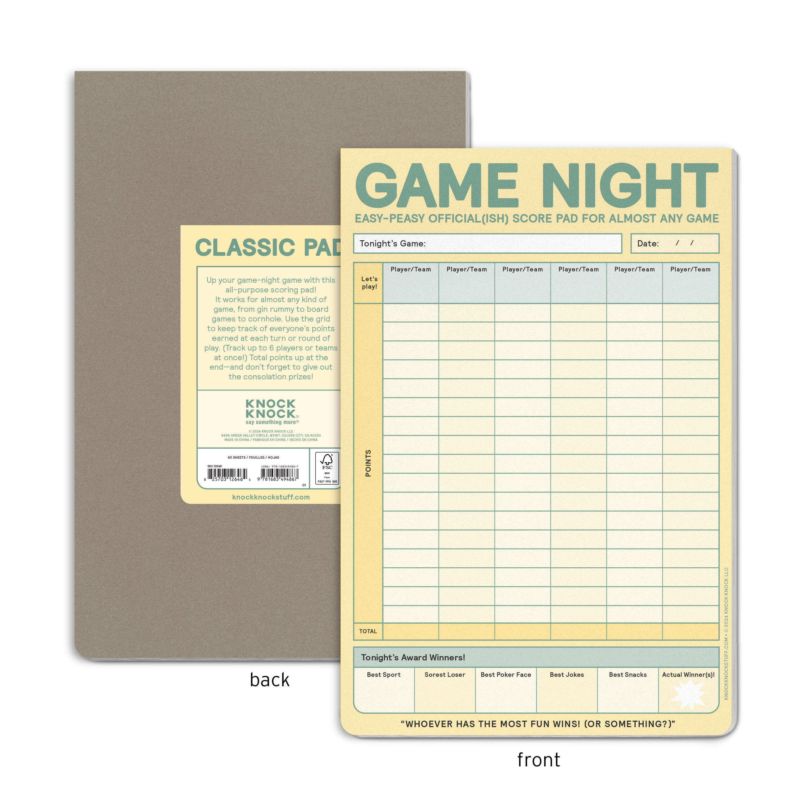 This all-purpose score pad / gaming notes pad works for almost any kind of game, from gin rummy to board games to cornhole. Use the grid to keep track of everyone’s points earned at each turn or round of play. (Track up to 6 players or teams at once!) Total points up at the end—and don’t forget to give out the consolation prizes!