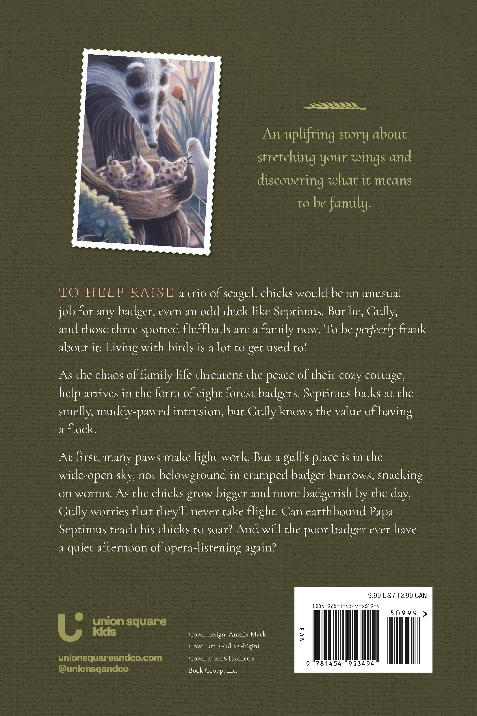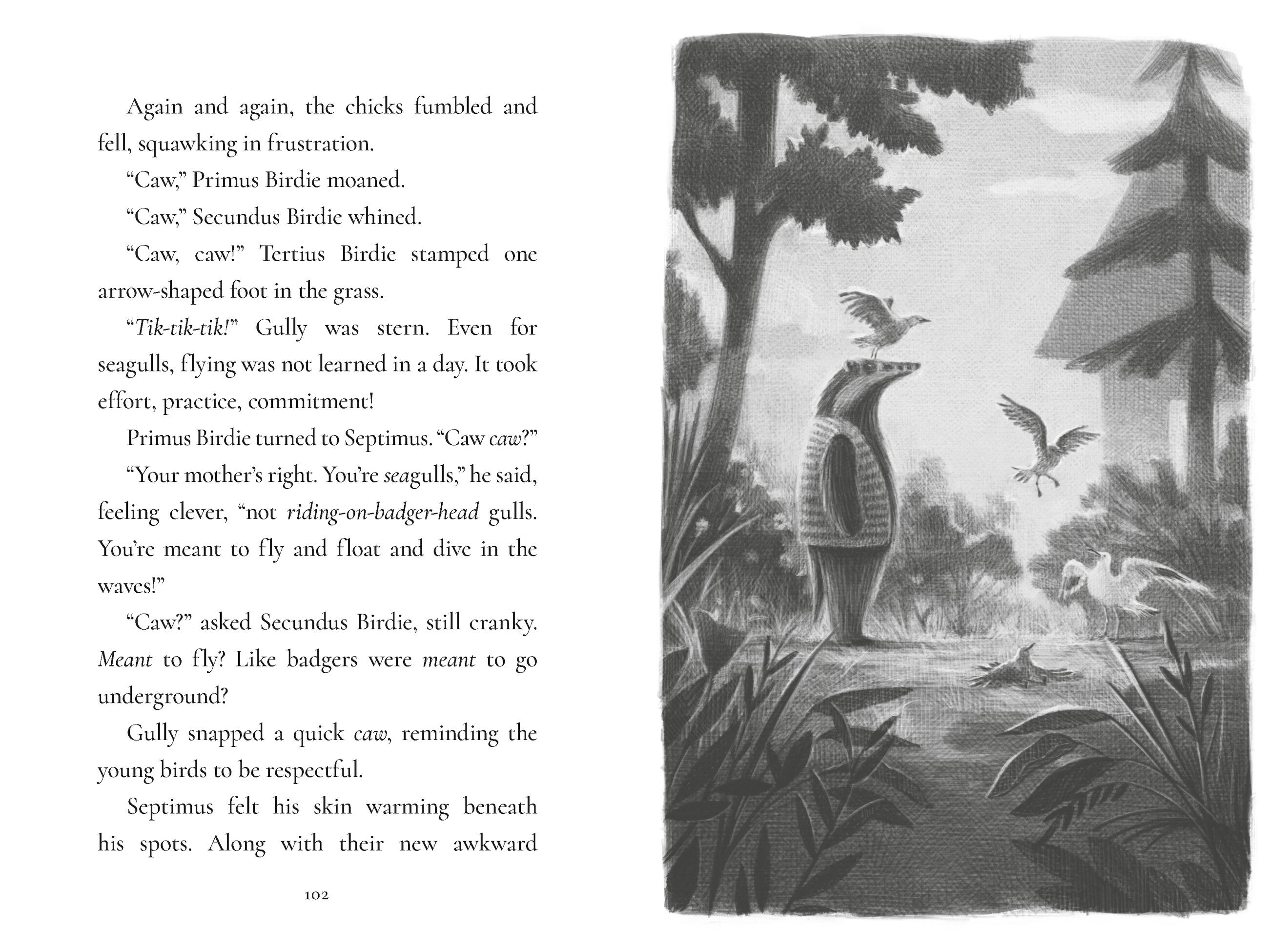Just when it seems Septimus might get a bit of the bird-free, badger-only alone time he needs, a knock at the door brings a big surprise: eight visiting forest badgers! As the chicks take to burrowing underground and gobbling up worms with their new badger family, Gully worries they will never learn to take flight. Can Septimus find a way to give the chicks a proper liftoff? Or will their family fall apart instead?