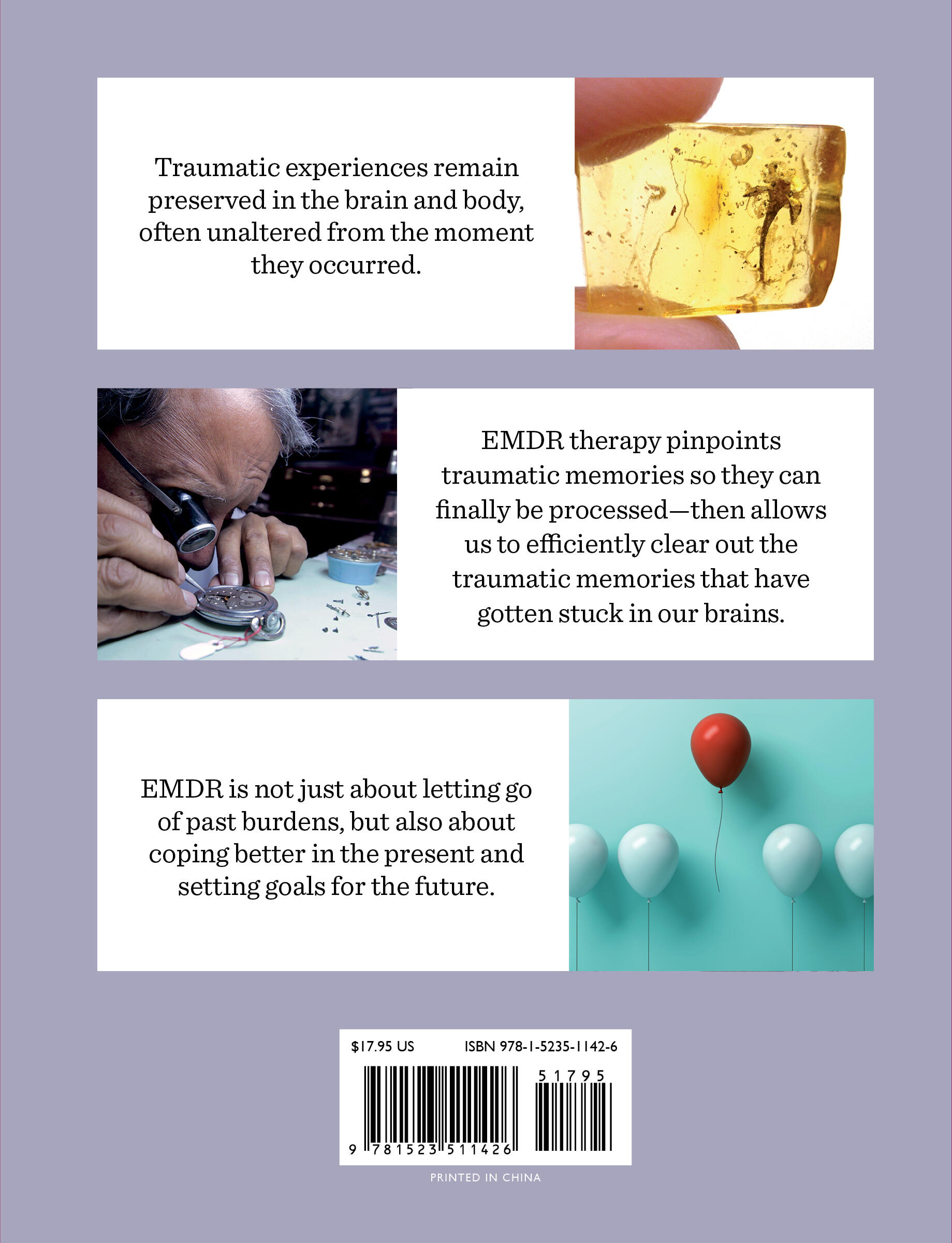 Through compelling science, personal stories, and powerful photographic images, we learn how trauma is stored in the brain and body, continuing to cause pain and suffering, and how EMDR frees us by repatterning our thinking and emotional reactions. It explains why talk therapy has only a limited impact on trauma recovery, describes what to expect from gentle and targeted EMDR therapy, and offers guidance on how to find a therapist who is just right for you.