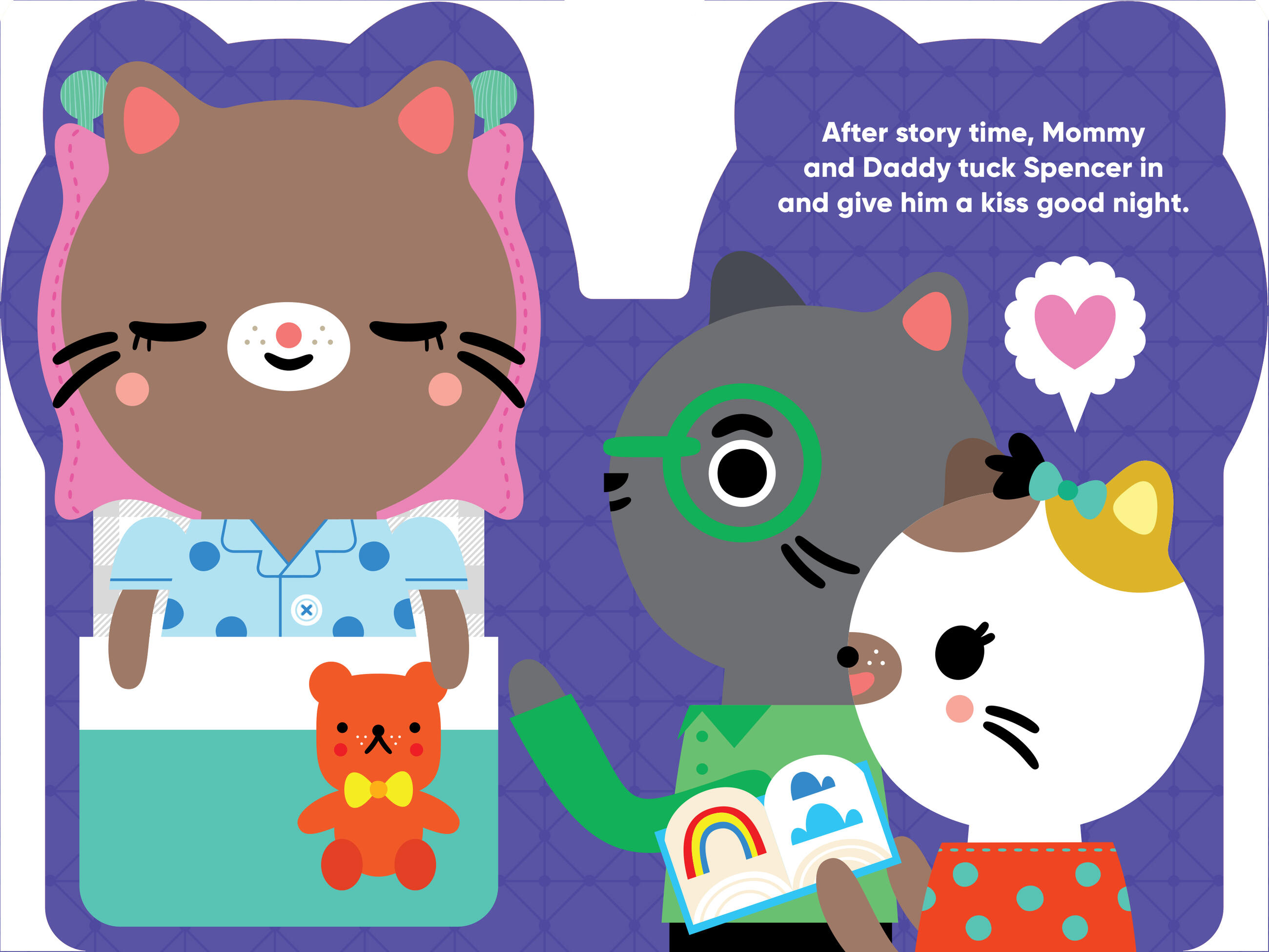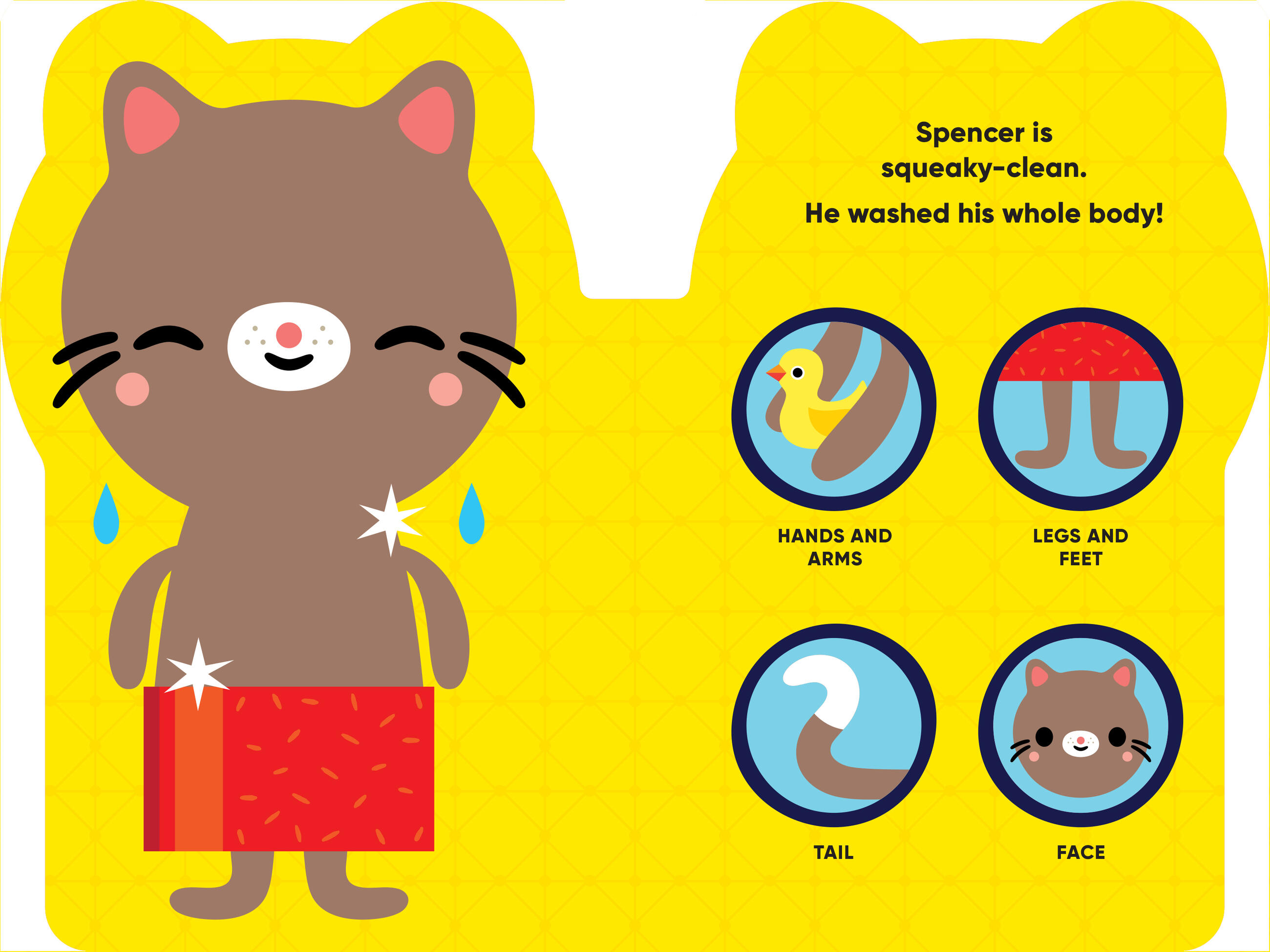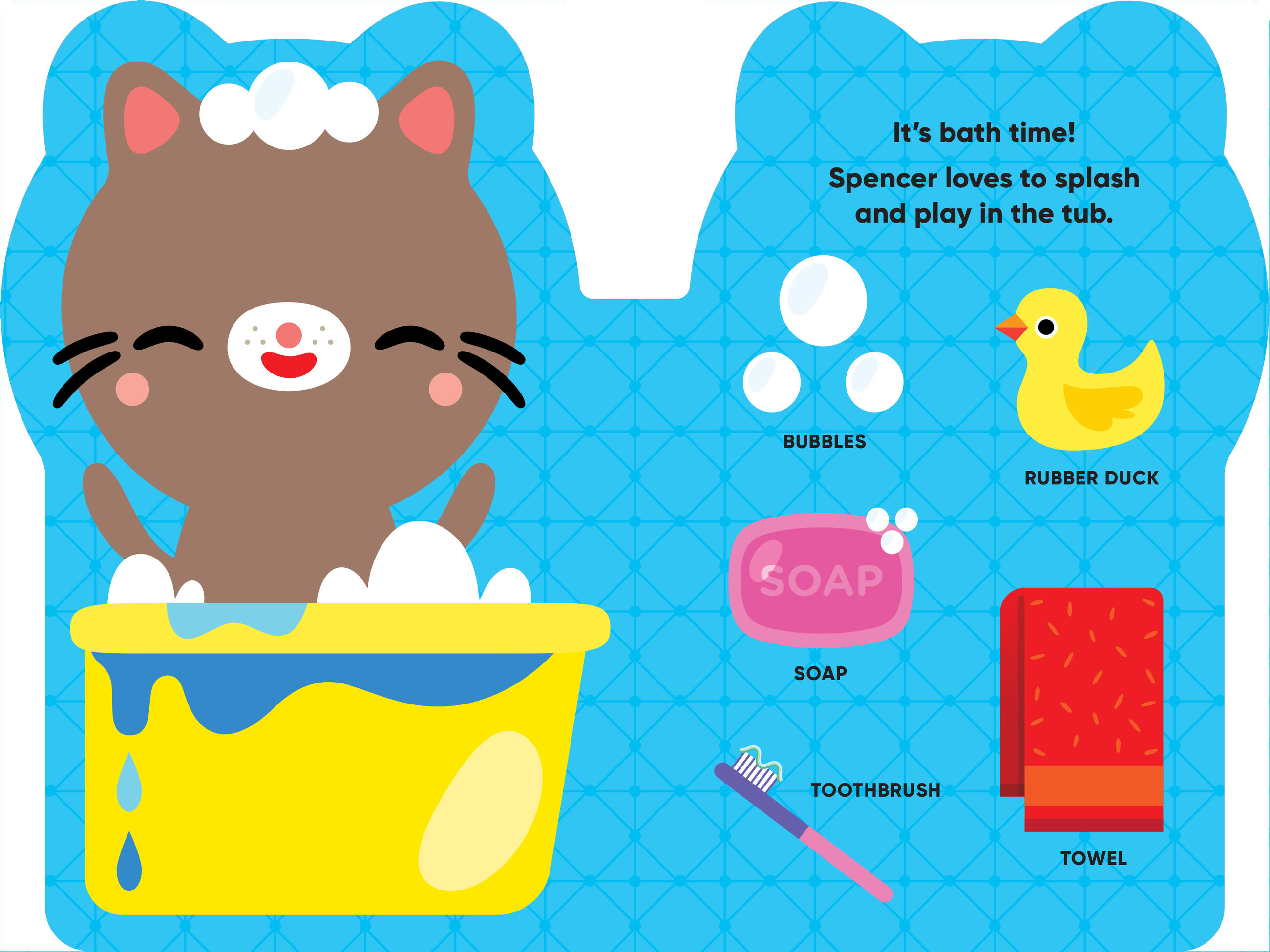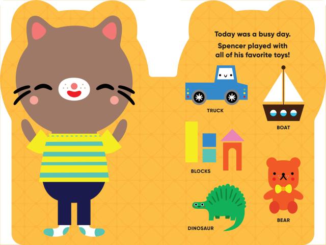 Here are Spencer’s pajamas and rubber duckie, toothbrush and a kiss good night. Get ready for bed with your new friend Spencer and learn all the words in his world!