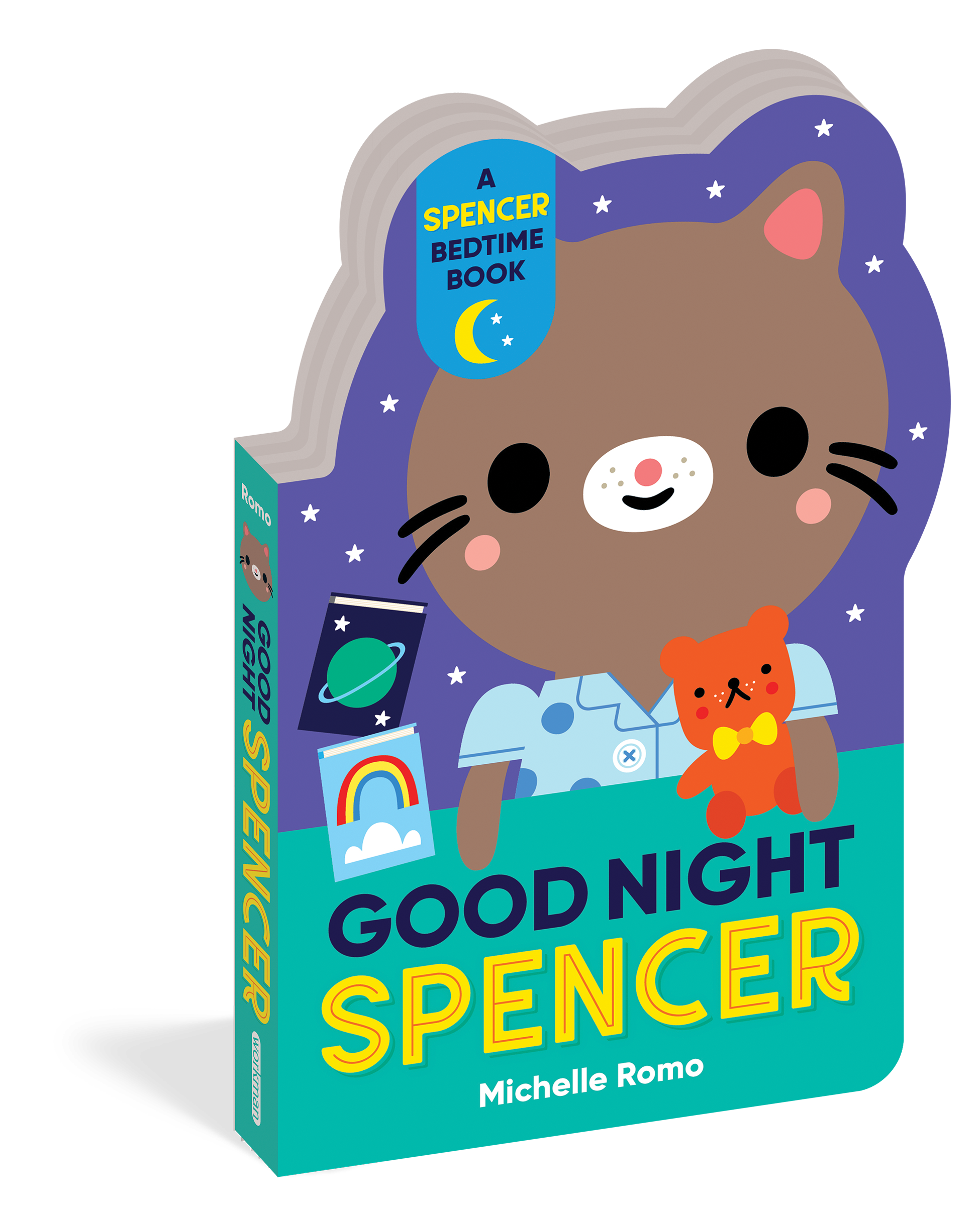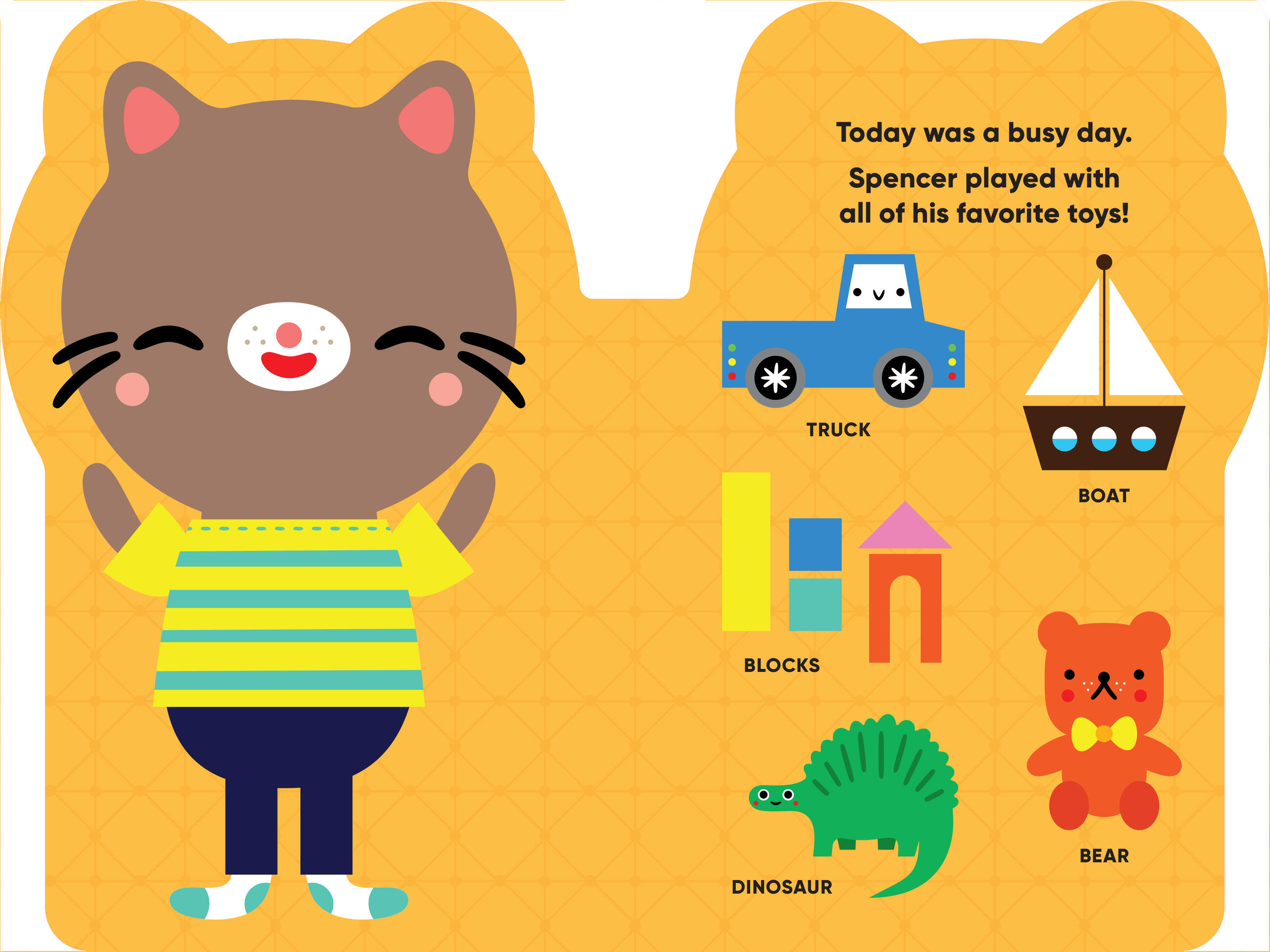 Spencer is a sweet little kitten in a board book shaped just like him! Bright, bold illustrations, simple text, and vocabulary labeled on each page help toddlers with language acquisition.