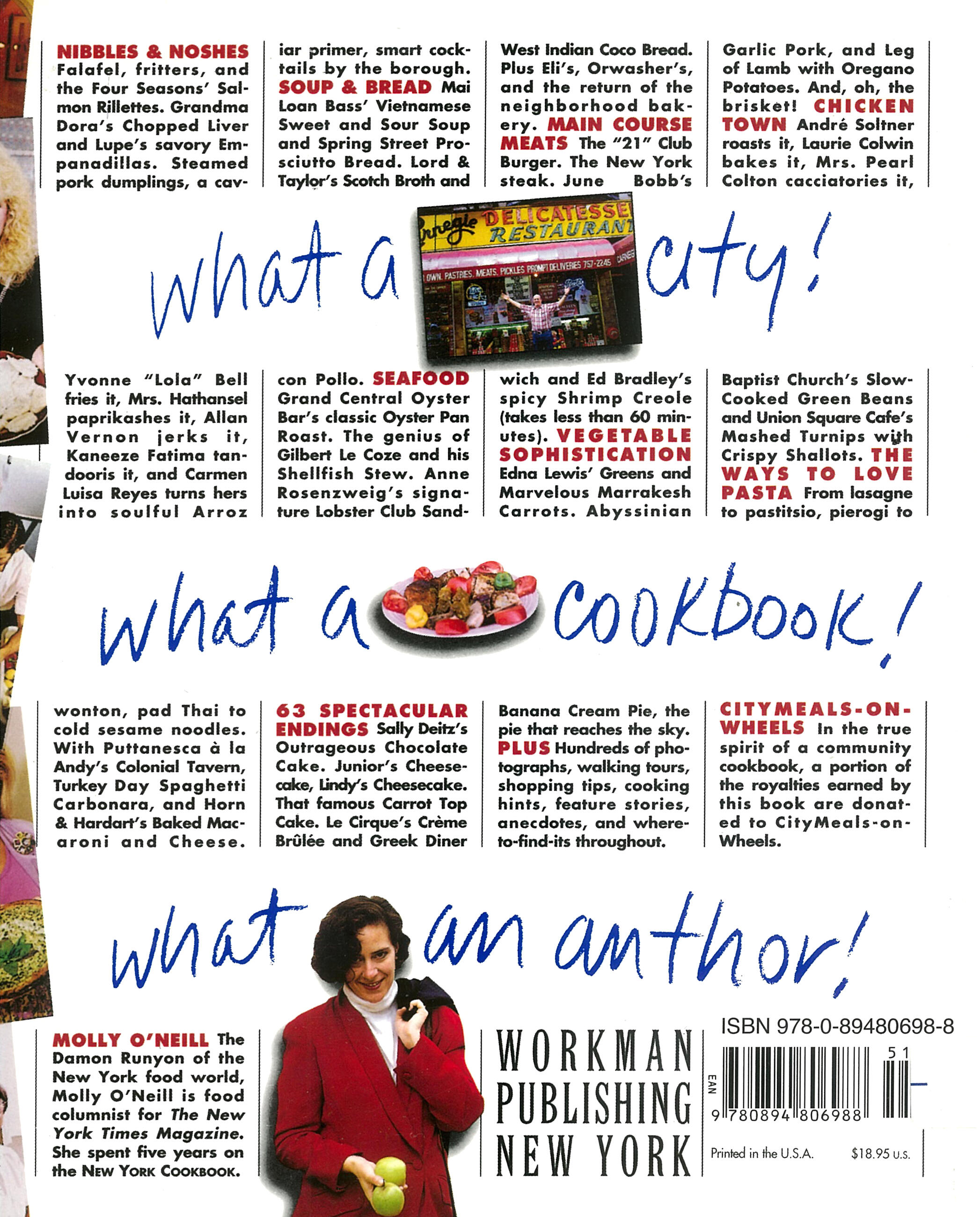 Nibbles and noshes from New York City, America’s kitchen. New York is pierogi, pasta fagiole, and chicken soup: Avgolemono, Brazilian Canja, Kreplach, Soo Chow, and Ajiaco. New York is Sylvia’s Ribs, plus Edna Lewis’s Greens and Mrs. Kornick’s Polish Corn Bread. And the New York Cookbook is all of this, and much, much more. Collected from all five boroughs by New York Times food writer Molly O’Neill, here are over 500 recipes–and over 700 photographs–that celebrate one thing: a passion for food and eating.