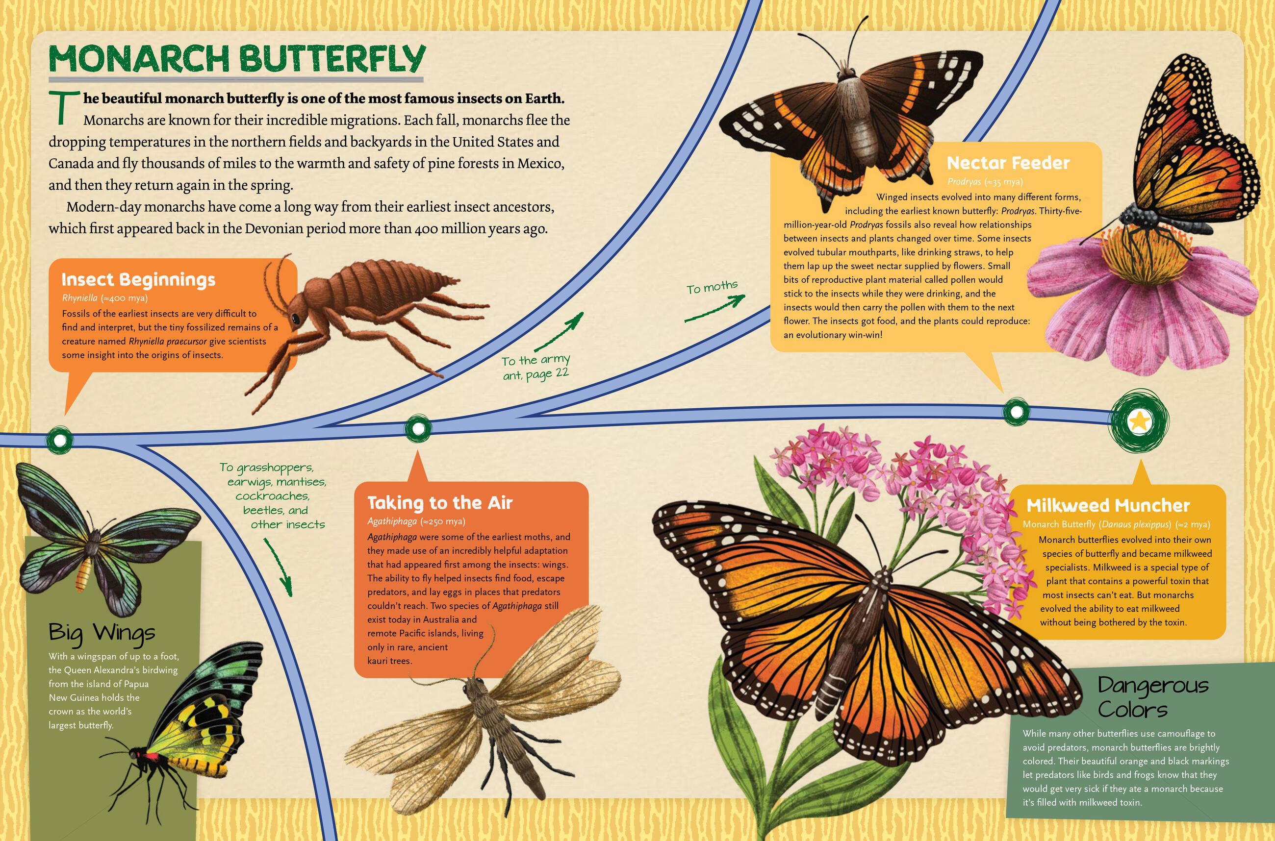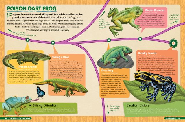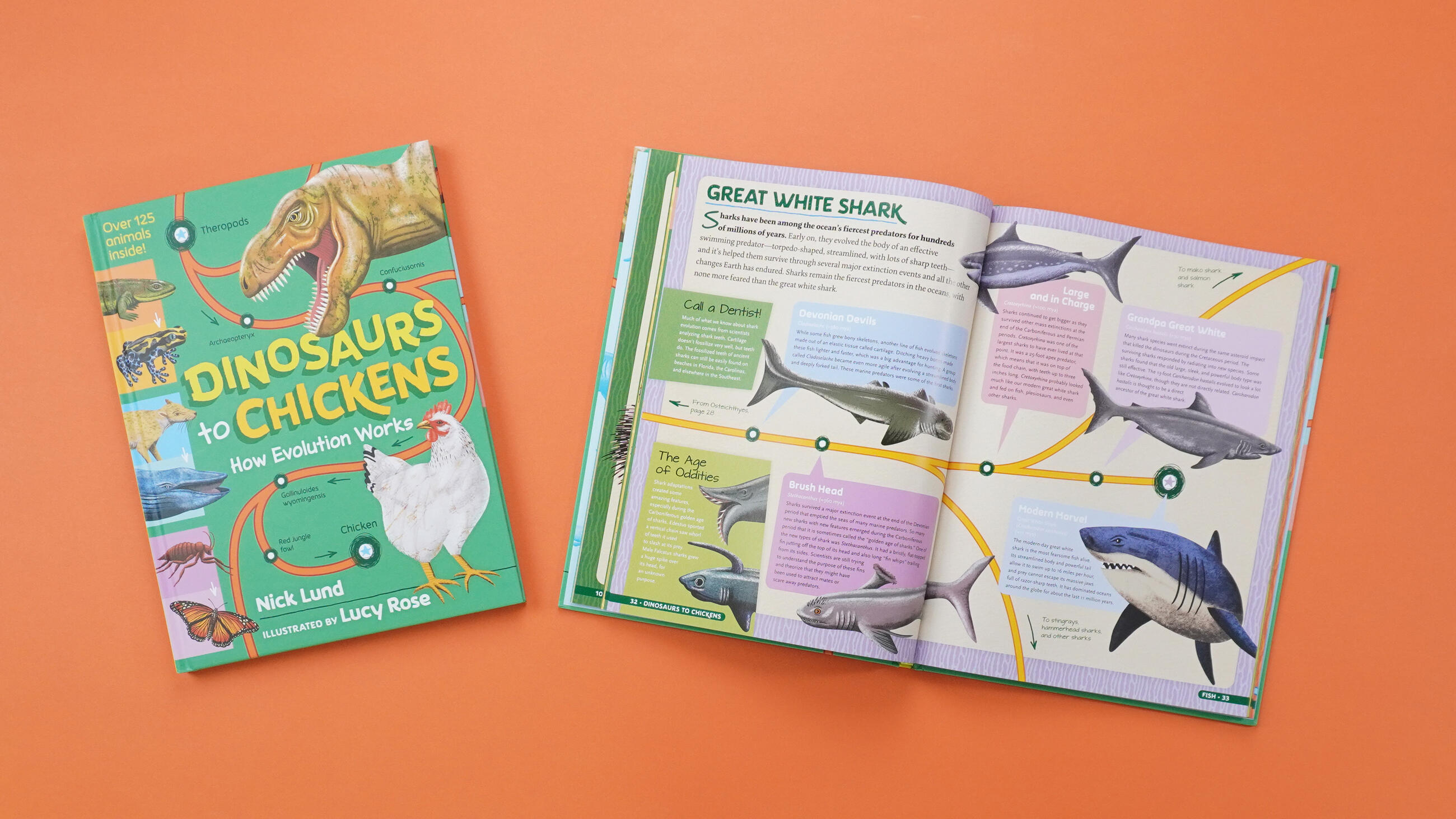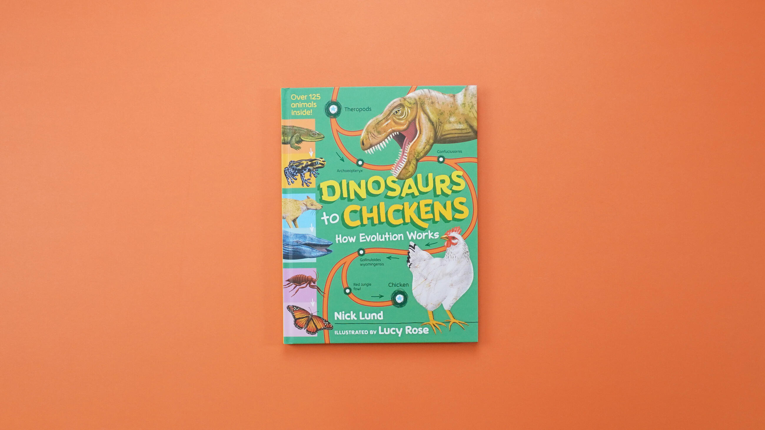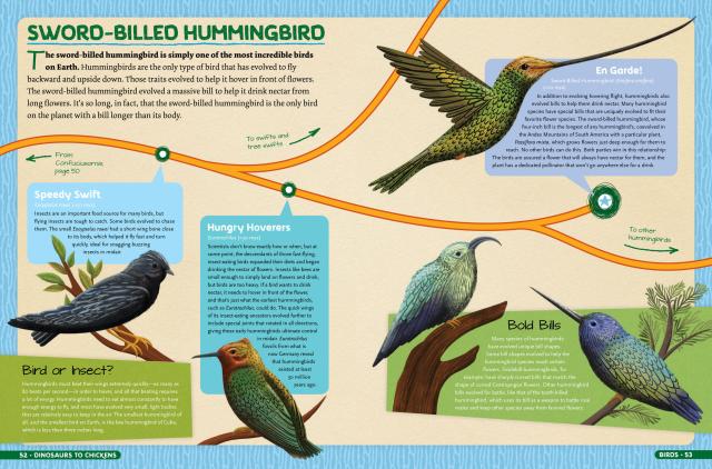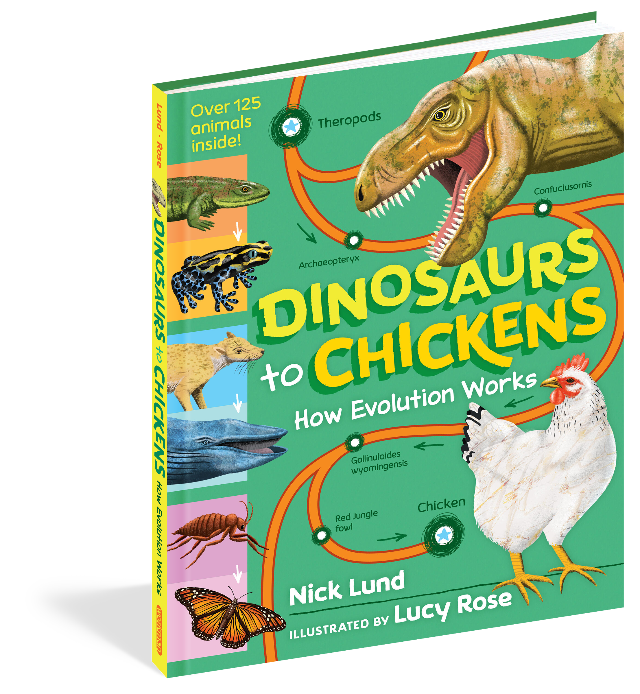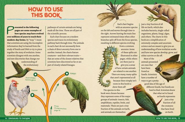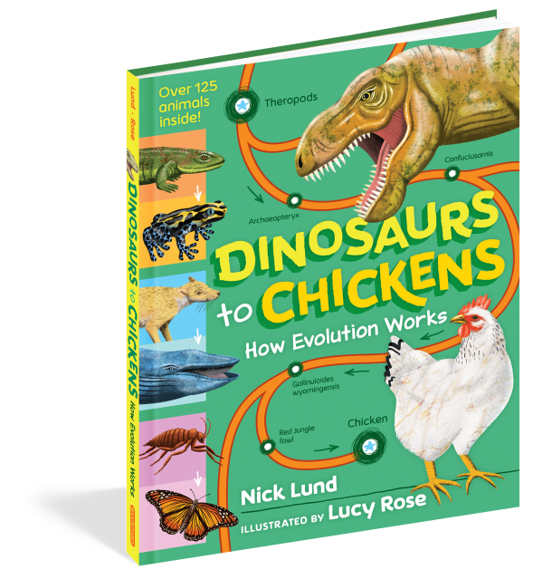 Dinosaurs to Chickens: How Evolution Works showcases over 125 animals in 30 charts that feature most astonishing evolutions in Earth’s history! Track the evolution of traits from the Tyrannosaurus Rex’s to the chicken, the first insect to the monarch butterfly, the giant sloth to the armadillo and many more. With full-color illustrations throughout, plus a gatefold showing how species connect and evolve via the “Tree of Life”, this book makes the science of evolution an exciting and accessible topic for young readers, and will capture the fascination of kids who already love science, dinosaurs and fossils.