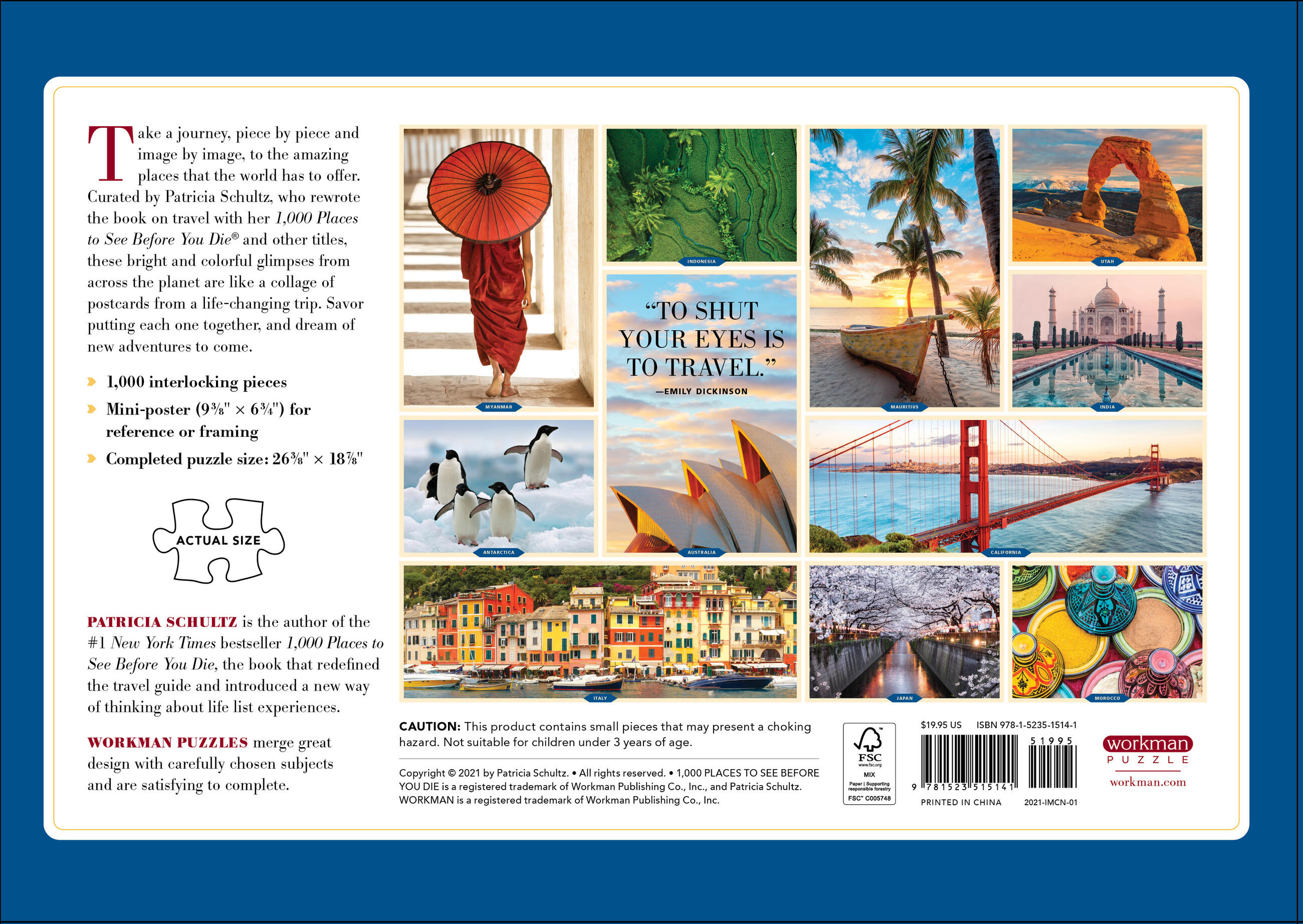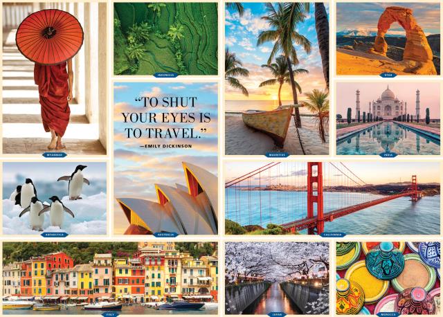 Take a journey, piece by piece and image by image, to the amazing places that the world has to offer. Curated by Patricia Schultz, who rewrote the book on travel with her 1,000 Places to See Before You Die® and other titles, these bright and colorful glimpses from across the planet are like a collage of postcards from a life-changing trip. Savor putting each one together, and dream of new adventures to come.