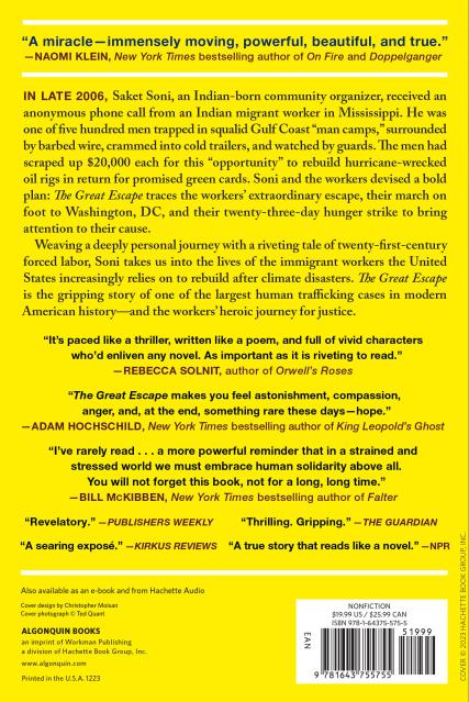 Weaving a deeply personal journey with a riveting tale of twenty-first-century forced labor, Soni takes us into the lives of the immigrant workers the United States increasingly relies on to rebuild after climate disasters. The Great Escape is the gripping story of one of the largest human trafficking cases in modern American history—and the workers’ heroic journey for justice.