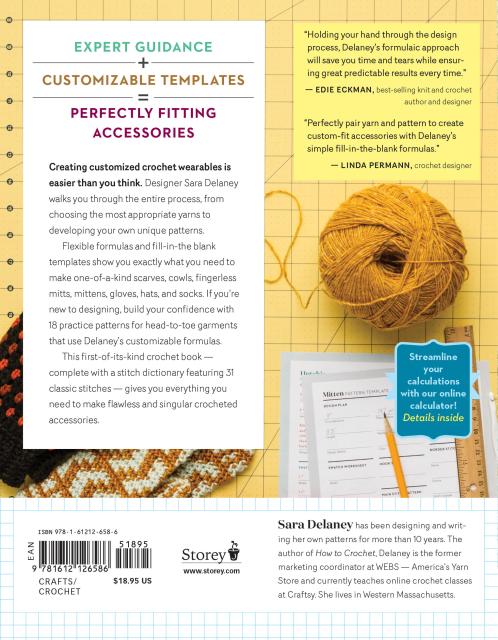 You love to crochet, but you’re tired of the granny square and other predictable projects. Let celebrated crochet teacher Sara Delaney help you expand your skills while showing you how to create custom-fit wearable accessories. Delaney’s unique, flexible formulas let crocheters of all levels easily design scarves, cowls, fingerless mitts, mittens, gloves, hats, and socks. With fill-in-the-blank templates and a stitch dictionary, you can use your favorite yarn and stitch pattern, and make accessories that fit perfectly. Delaney offers a starter course in the technique with 18 of her own original patterns, along with the formulas she used to create them. The companion online calculator helps create your customized patterns even more quickly!