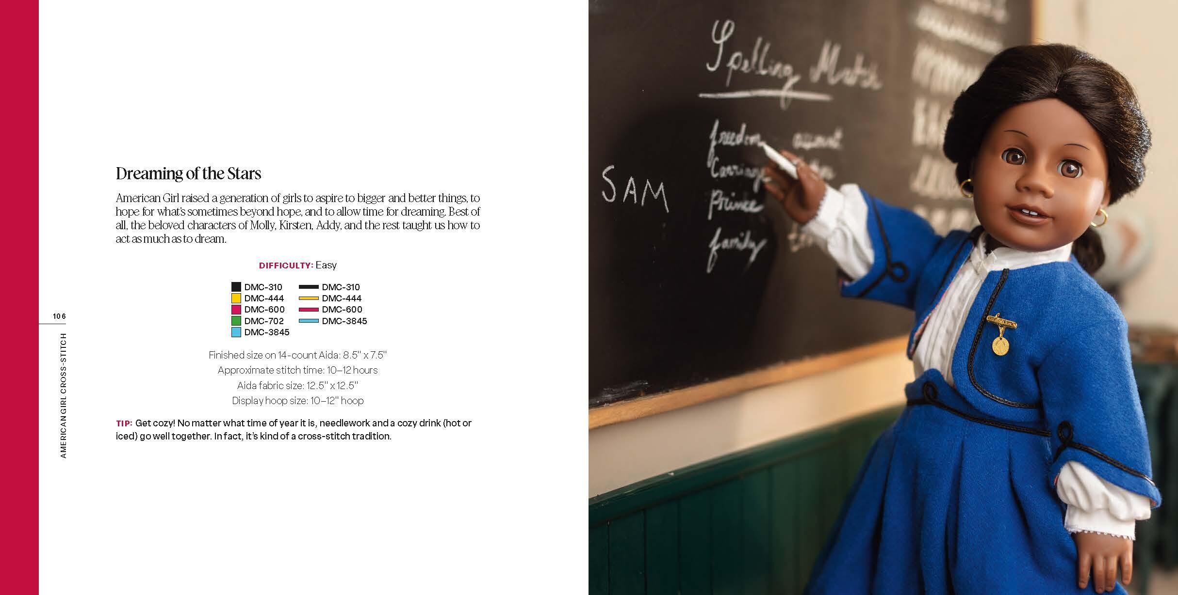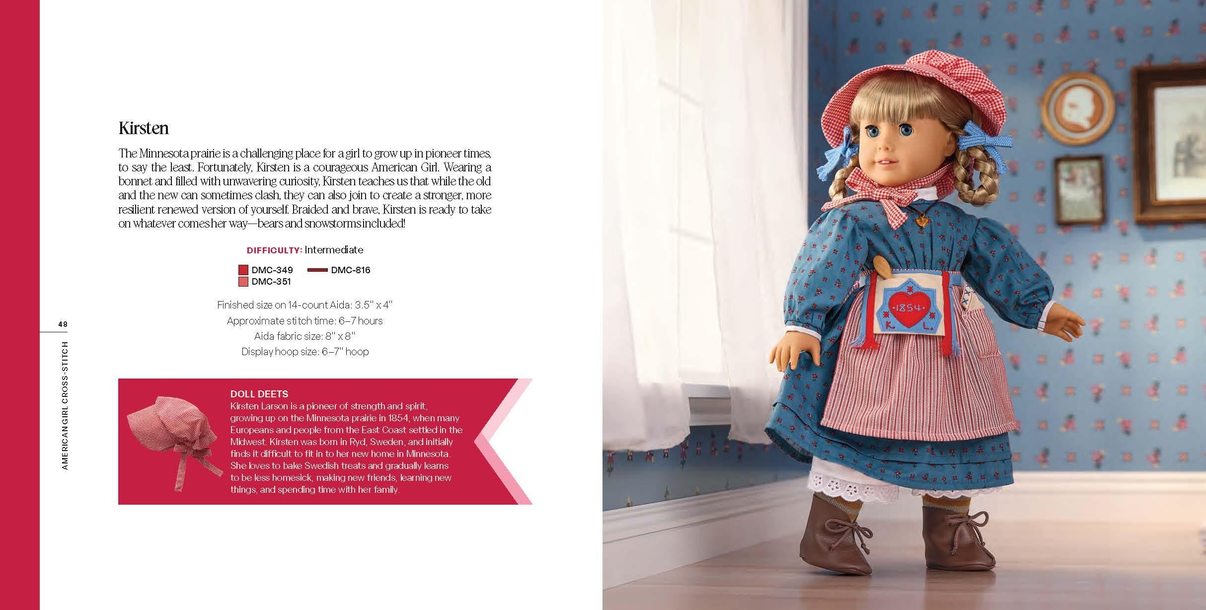 You will love the range of designs included, from American Girl silhouettes and a Care & Keeping of You pattern to depictions of each of the Historical Characters (you can stitch “I’m a Kit” with the Kit hat design!). Complete with helpful diagrams, charts, and photographs of the complete patterns to guide your work, these sweet designs will warm the heart and help you show off your American Girl spirit.