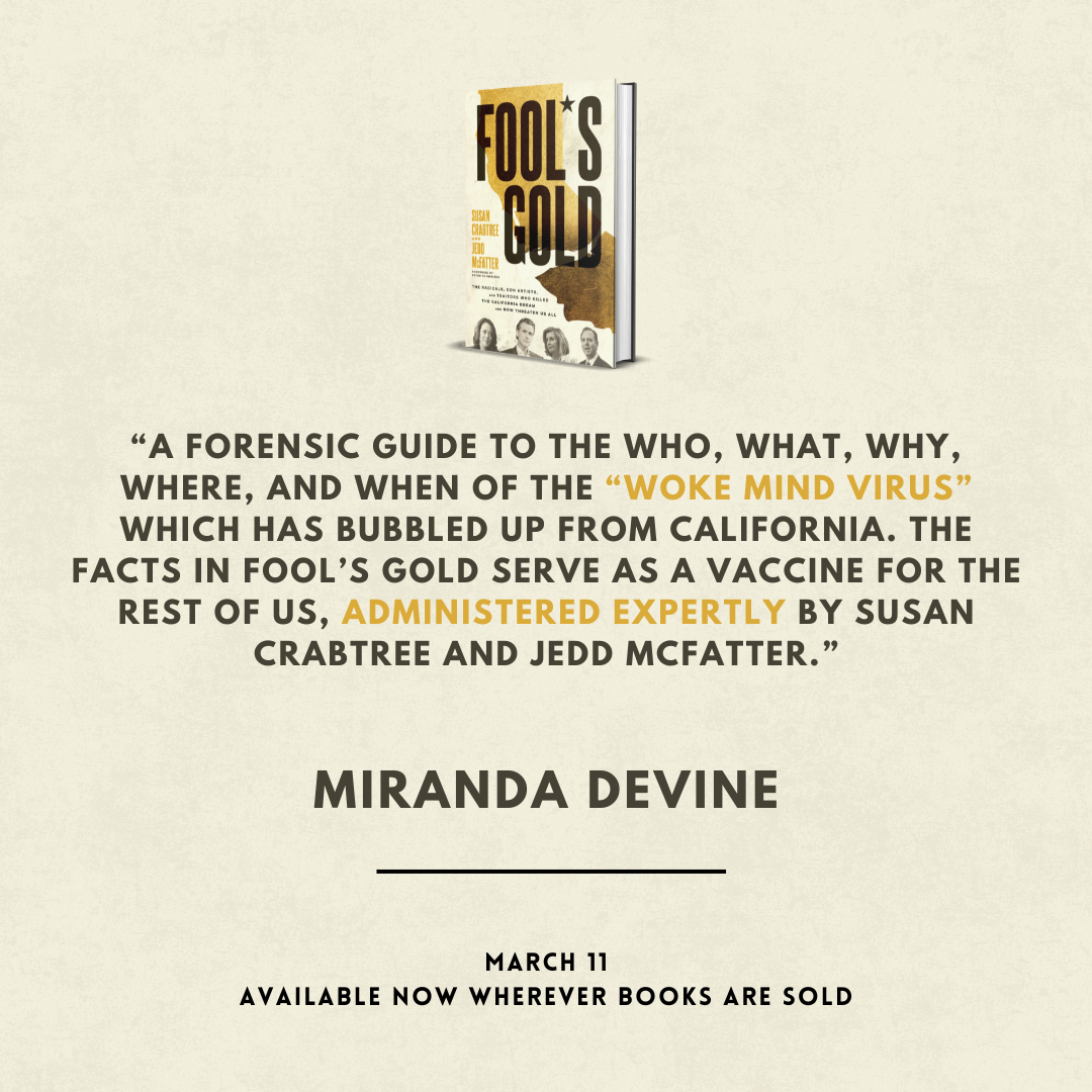 "A forensic guide to the who, what, why, where, and when of the “woke mind virus” which has bubbled up from California. The facts in Fool’s Gold serve as a vaccine for the rest of us, administered expertly by Susan Crabtree and Jedd McFatter."MIRANDA DEVINE