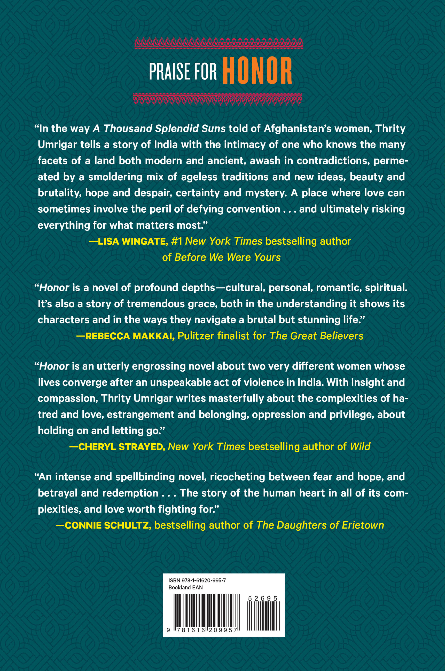 “Honor is an utterly engrossing novel about two very different women whose lives converge after an unspeakable act of violence in India. With insight and compassion, Thrity Umrigar writes masterfully about the complexities of hatred and love, estrangement and belonging, oppression and privilege, about holding on and letting go. A powerful, important, unforgettable book.”BookClubs.com “With Honor, Thrity Umrigar continues her habit of laying bare the folly of our perceived differences. This is an intense and spellbinding novel, ricocheting between fear and hope, betrayal and redemption. It is the story of the human heart in all its complexities, and love worth fighting for.”—Connie Schultz, bestselling author of The Daughters of Erietown