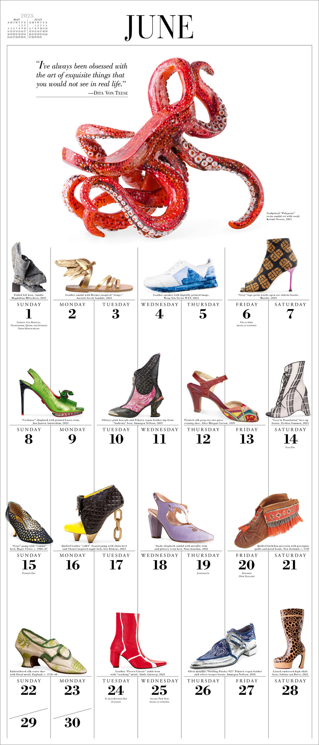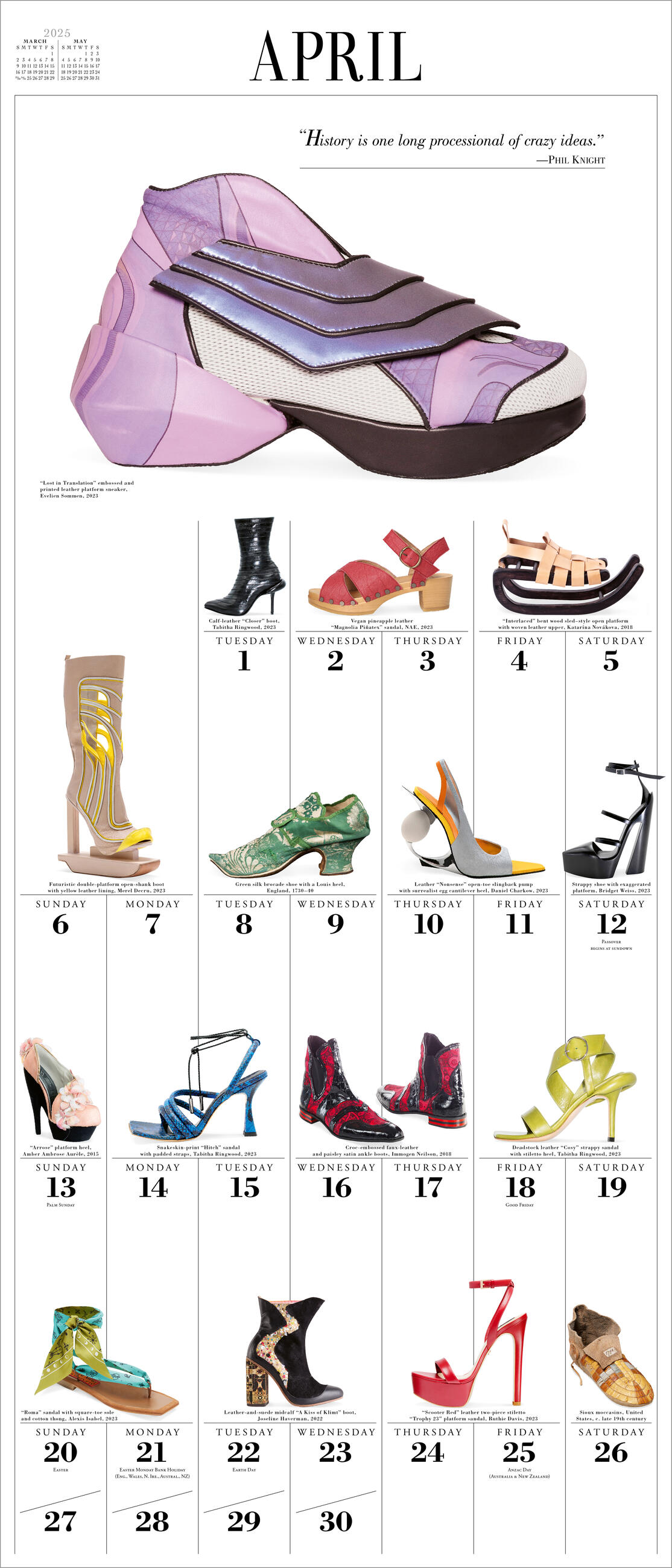 - FEED THE FOOTWEAR OBSESSION: A closet full of shoes in a 12” x 14” calendar. Slides, pumps, sneakers, mules, stilettos, and more every month, from studded leather ankle boots by Attilio Giusti Leombruni to 16th century silk court shoes.