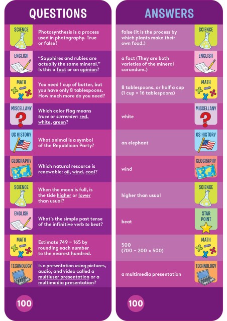 "The look has been modernized and the material has been updated since you were a kid — it’s based on school curriculums, with categories for the third-grade set including math, science, social studies, and language arts. But in this form, the quizzing doesn’t feel like school; it becomes a game that can be played anywhere, including in a car or on a plane."