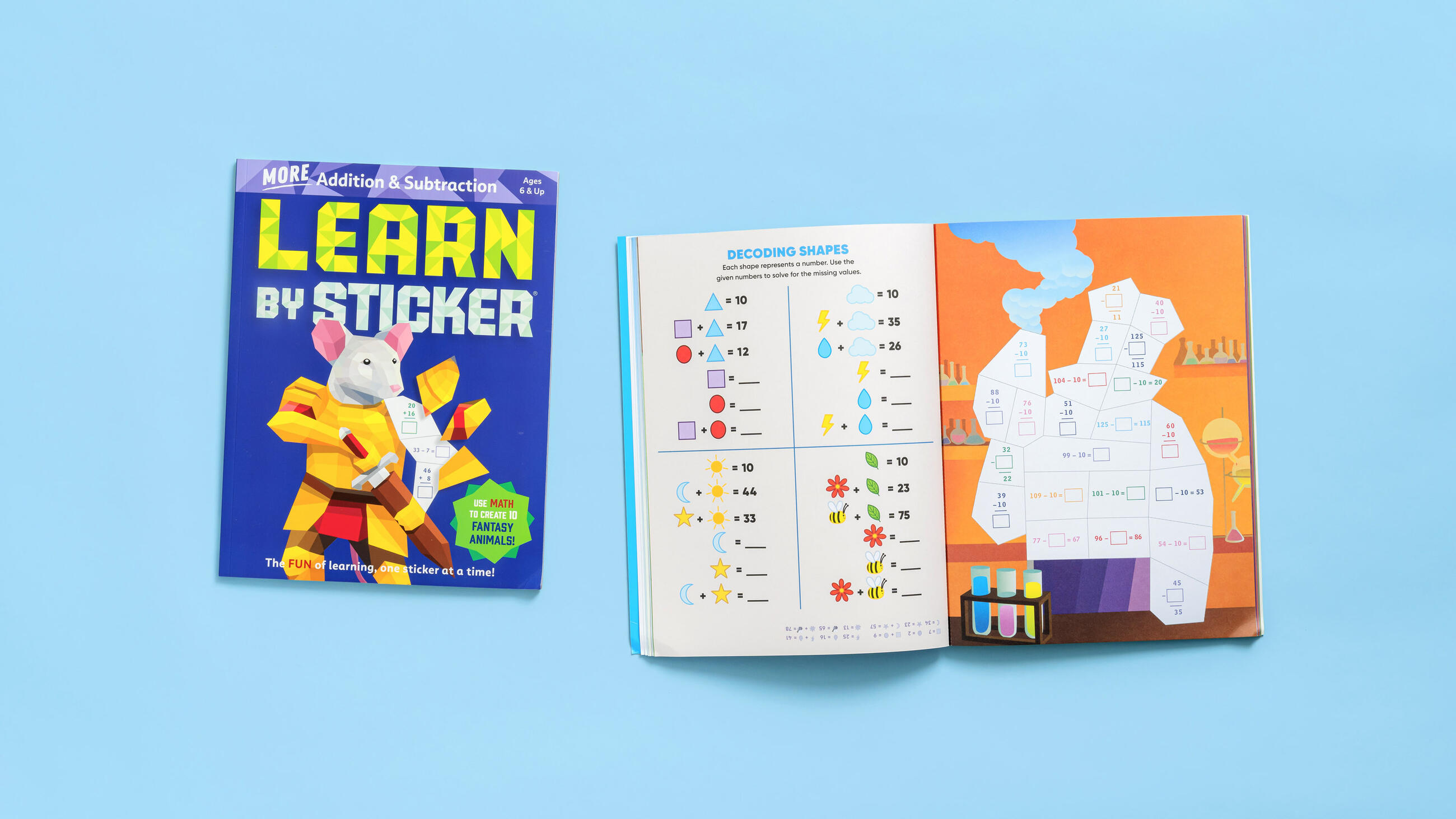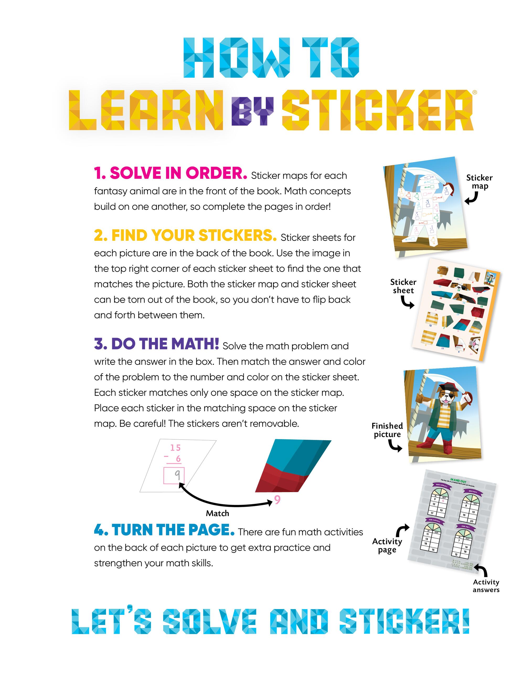 In Learn by Sticker: More Addition and Subtraction, solve second grade-level addition and subtraction problems and use the answers to determine where to place each sticker to create ten sticker images of charming fantasy animals. Plus, the back of each sticker page contains fun, critical thinking-based math activities like solving riddles, decoding secret messages, and more.