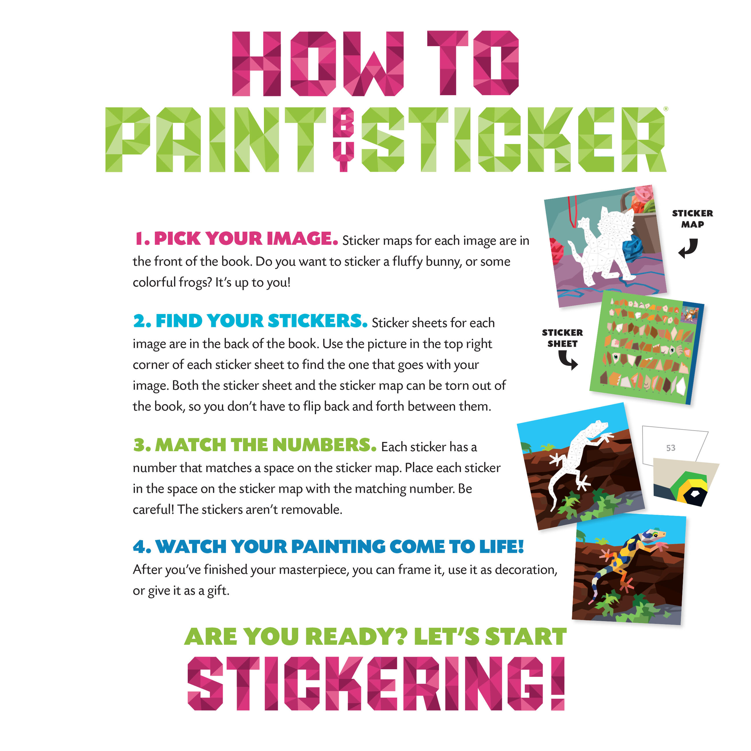 Enjoy hours of screen-free, mess-free, crafting fun with this vibrant sticker book featuring ten adorable pets, including a loyal dog, a playful kitten, a colorful lizard, and more! All you need to do is: